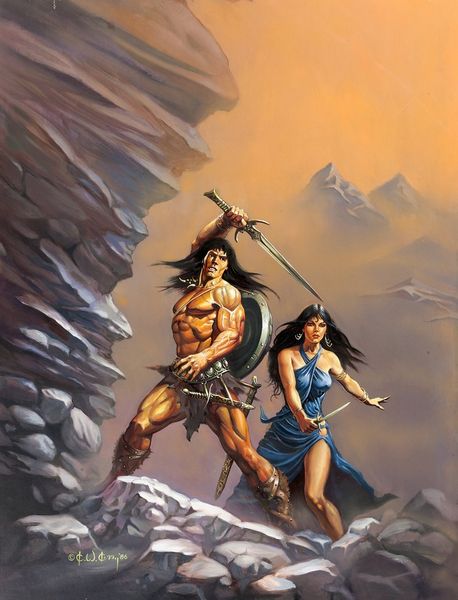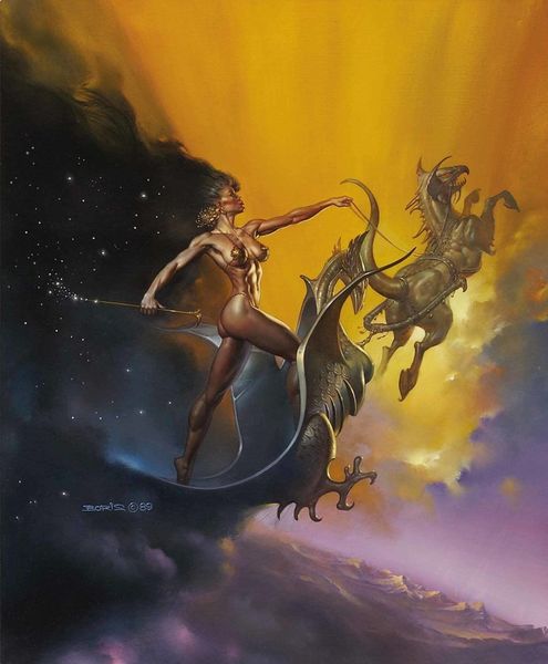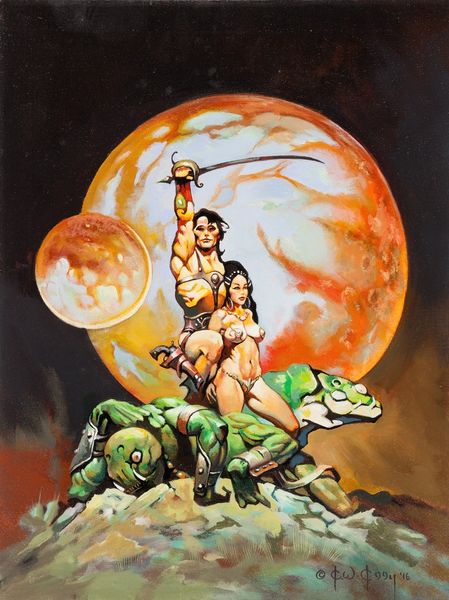 Editor: Here we have Ken Kelly's paperback cover for "Ylana of Callisto" from 1977, created with acrylics. There's a definite power dynamic being suggested in the image, with the female figure and tiger looming against an alien landscape. It's interesting, but where does it fit into art history? Curator: Well, look at when it was made - the late 70s. This was a period saturated with pulp fantasy. Think of the rise of role-playing games, heavy metal album art, and, of course, the renewed interest in heroic fantasy authors like Robert E. Howard. This cover participates in a visual language already being forged in other areas of pop culture, trading on notions of adventure and female empowerment. How do you think this imagery reflects contemporary social changes, even subtly? Editor: I guess the empowered female figure feels progressive. I’m wondering, though, about its appeal beyond pulp fiction aesthetics. Curator: Exactly. The figure’s pose and attire borrow heavily from a history of pin-up and glamour photography that goes all the way back to the mid-20th century, but they were given license and acceptability because they’re placed in the world of “fantasy.” In some ways, this creates a very traditional dynamic even in this ‘progressive’ painting. How would we see the reception of this piece differ based on, say, its location in an art gallery versus on the cover of a mass-market book? Editor: That's a good point. Context really shifts how it’s viewed and who it’s even meant for. Seeing it framed here highlights those aspects. Curator: It's fascinating how artistic trends like fantasy art intersect with social perceptions, and commercial demands, creating imagery that reflects, reinforces, and sometimes challenges existing norms. Editor: It really gives you a new lens for viewing such artwork, something I'll certainly consider moving forward!