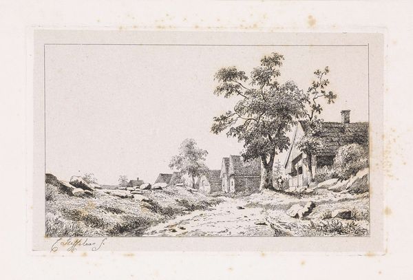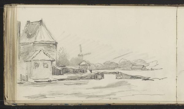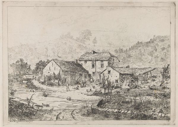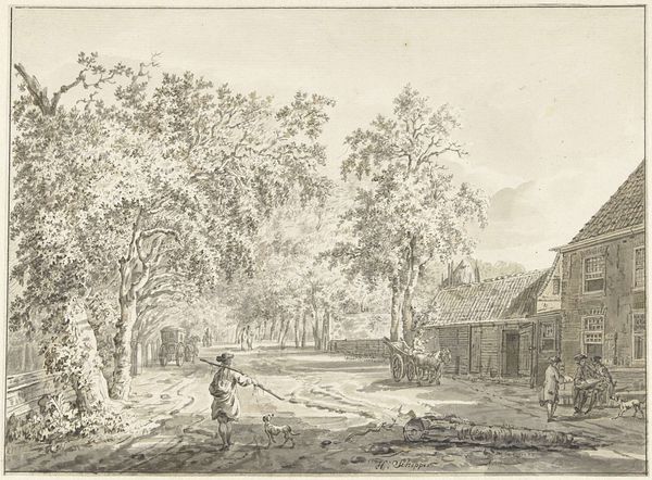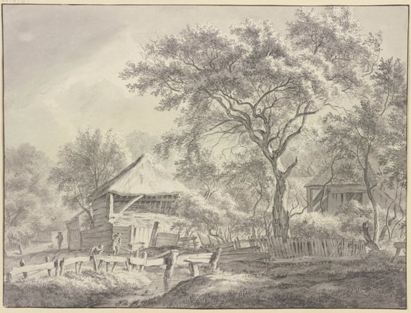 Daniël Dupré sketched “Kerkje of klooster bij Bologna” using pen in brown and grey ink and brush in grey ink. This monochrome landscape drawing uses gentle washes of grey ink to model the simple architectural forms of the church and its surrounding environment, creating a serene and contemplative mood. Dupré manipulates the elements of line and form to guide our perception. The composition, with the church set atop a hill, emphasizes a sense of elevation and spiritual aspiration, drawing the eye upward and across the landscape. Notice how the use of linear perspective is subtle but effective, suggesting depth and distance. The delicate, almost hesitant lines capture the architecture with precision while softening the overall effect to create a sense of peace. The light-and-shadow play accentuates the architectural details, rendering the church not just as a building, but as a structure deeply embedded within its natural setting. Through his manipulation of light, form, and line, Dupré invites us to reflect on the intersection of human construction and the natural world.