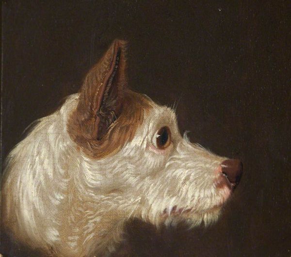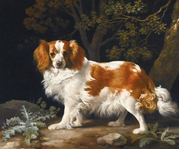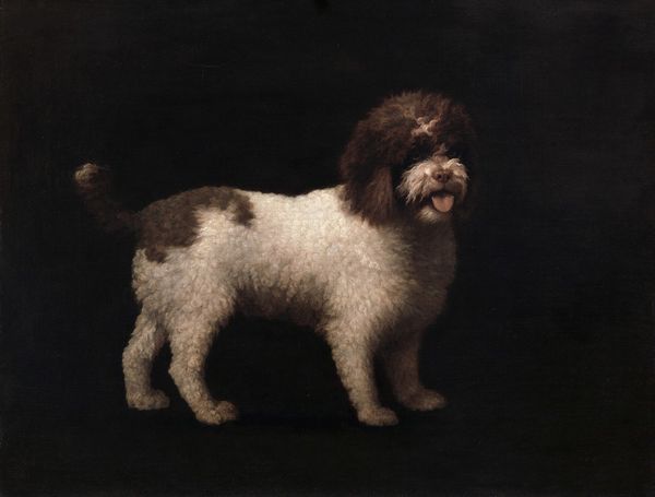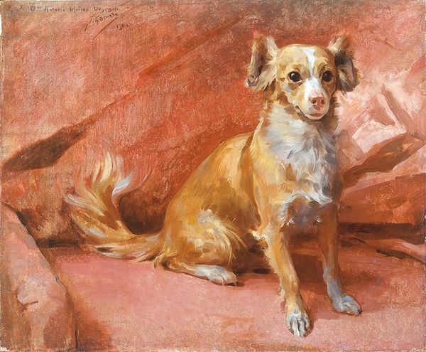 Curator: "Sitting on Cushions Dog" created by Gustave Courbet in 1855 offers a unique insight into Courbet’s perspective, moving into the domestic sphere of genre painting with this lovely oil on canvas. Editor: The dog strikes me as rather dignified and definitely comfortable! It has this really intriguing blend of calm, regal composure, especially on that red fabric. Almost seems to be posing deliberately, doesn't it? Curator: Yes, Courbet’s shift toward subjects outside purely grand landscapes, is a very significant. To explore the social status through his artwork, as well as the changing economics around him, he focused on details and captured realism to showcase a different side of his art. Editor: And those crossed paws! Such a distinct posture to capture. Looking at this fur reminds me of depictions of wealth and status during that period; what’s the material construction of the cushion all about? Curator: Given the luxurious red fabric of the cushions, probably velvet. A commodity produced within the socio-economic spheres, available to wealthy society and also made accessible to showcase social mobility through its artistic representations in paintings. Editor: It’s incredible how objects from a certain period become symbols later in our culture; this regal and relaxed animal becomes the emblem of loyalty, trust, companionship and, in modern times, the figurehead for comfort and familiarity. What does it mean to create a dog portrait? Is it to show power through a domesticated animal or love through friendship? Curator: Well, Courbet uses very textured brushstrokes. It isn’t perfectly polished, but deliberate brush strokes showing this attention to detail really makes the dog alive to the audience. Editor: That texture is exactly what gives it depth! Thinking about it, paintings of animals often speak volumes about the artist's, or perhaps society’s relationship with nature and its representations. I wonder, could this animal in an art piece, function almost as a spirit animal for both the painter and the audience? Curator: Certainly something to consider when approaching a painting like this! A wonderful depiction of the relationship between commodity and symbolism, truly. Editor: An indeed thoughtful reflection on domestication, wealth and artistic agency in animal portrayals.