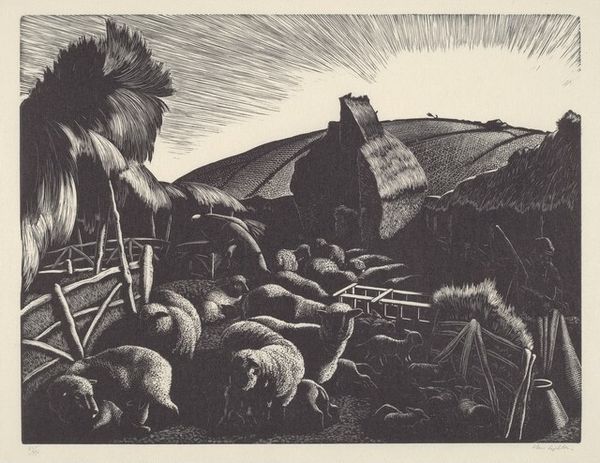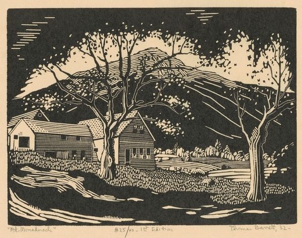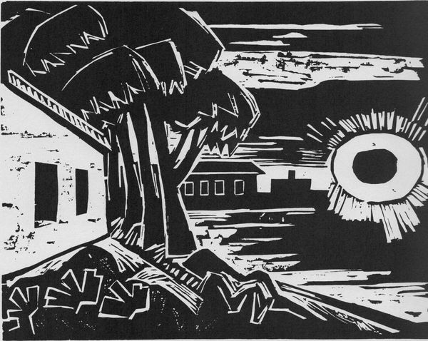 Loraine Elizabeth Moore created this print, "Arcadia," employing stark contrasts and angular lines to depict a rural scene. The dominant visual experience here is the interplay between solid black shapes and negative white spaces. The composition divides the scene into distinct zones of light and shadow, creating a striking visual rhythm. Notice how the telephone pole boldly intersects the foreground, leading the eye towards the cluster of buildings, while the sky broods overhead with heavy black clouds. Moore's choice of black and white emphasizes the structure and form of each element, reducing them to essential shapes. This simplification invites us to contemplate the underlying structures of rural life. The absence of colour directs our attention to the textures and patterns created by the artist’s technique. Through this interplay of form and contrast, Moore's "Arcadia" challenges traditional notions of beauty, urging us to find meaning in the raw, elemental aspects of the landscape and the structures within it.