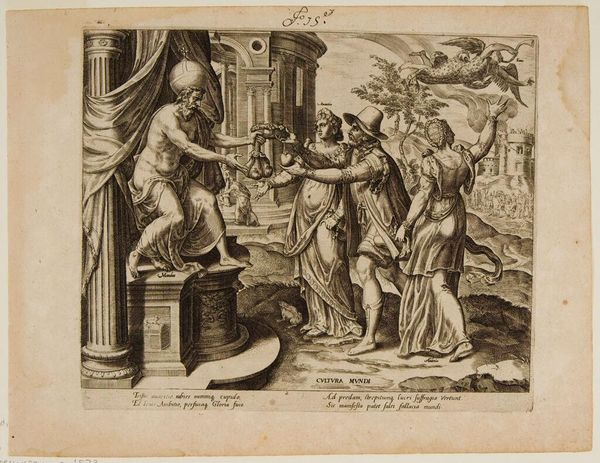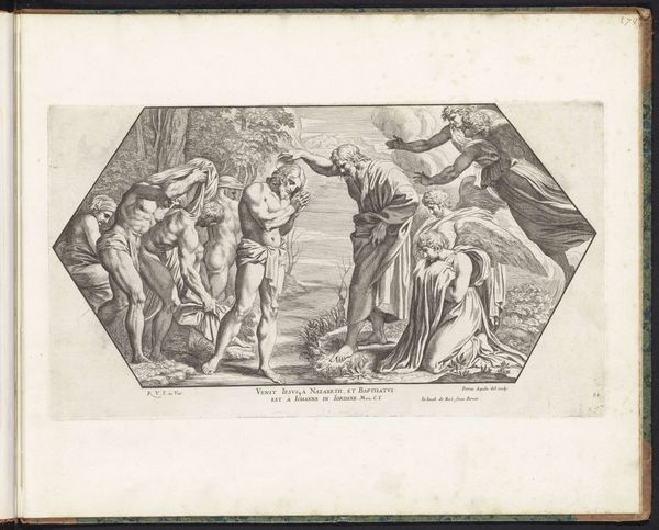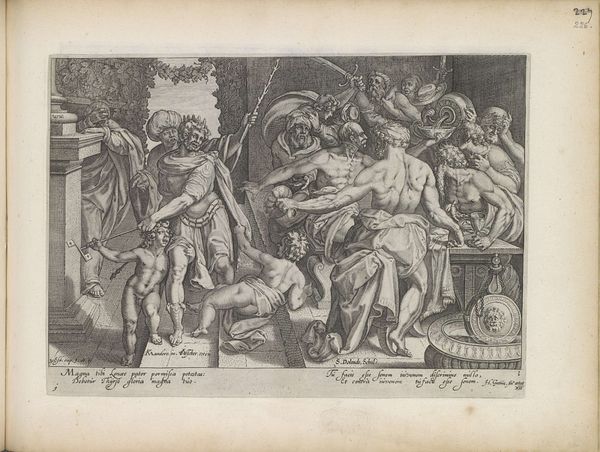 Pietro Aquila created this engraving titled "Oordeel van Salomo" sometime between 1650 and 1700. The scene is dominated by a stark contrast between the static, almost theatrical composition of King Solomon on his throne and the dynamic, emotionally charged figures in the foreground. Note how the artist uses line and form to create a sense of drama. The sharp, decisive lines of the executioner's sword and the anguished gestures of the women create movement and tension. Solomon's figure, framed by architectural elements, provides a stable, central point around which the chaos unfolds. The composition invites us to consider the interplay between justice, performance, and truth. Is Solomon's judgment a display of power, or a genuine quest for justice? Aquila's formal choices leave the question open, encouraging us to actively engage with the underlying themes of the artwork.