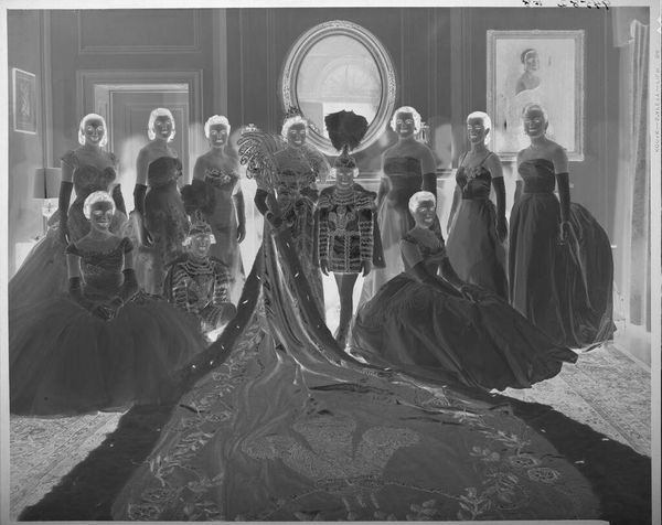 Editor: This photograph by Martin Schweig depicts a wedding party and, because it's a negative, it's hard to decipher the interplay between light and shadow. What formal elements stand out to you in this composition? Curator: Notice how Schweig uses the rectangular format to mirror the interior architecture. The carpet and the backdrop create distinct planes, emphasizing the two-dimensional nature of the image. The tonal inversions further abstract the scene. Editor: I see, the photograph itself becomes an object. I hadn't considered that. Curator: Indeed. The density of the floral arrangements and the textures of the clothing contribute to a complex interplay of forms, a deliberate obscuring of detail. What does this suggest to you? Editor: It almost feels like the image is more about form than the actual event. Thanks for pointing that out! Curator: My pleasure. By analyzing the formal structure, we reveal the artist’s intentionality.