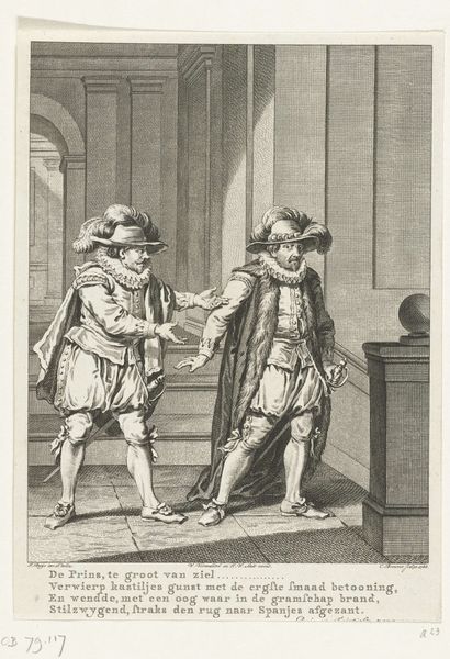 Editor: This engraving by Cornelis Bos, made around 1537-1555, is called "Dansend stel, de man draagt een hoed met een lange veer," which I believe translates to "Dancing Couple, the man wears a hat with a long feather." It's so detailed and feels incredibly theatrical. What can you tell me about it? Curator: This print offers a fascinating glimpse into the social fabric of the 16th century, doesn't it? Beyond just portraying a dancing couple, it reveals much about the materials available, the printmaking process, and the culture of consumption surrounding images at that time. Consider the paper itself – likely a relatively new commodity, playing a crucial role in the dissemination of ideas. Editor: That's interesting! I was so focused on the couple's outfits and how they were dancing that I didn't consider the significance of the paper itself. Curator: Exactly! And the engraving technique, too. How would the economics of engraving facilitate wider circulation? And also the clothing—reflect on how the very *making* of that clothing reflects the skills of specialized workshops, a burgeoning textile industry, and hierarchies of access. The "dance" becomes secondary to a deep dive into modes of production. What do you make of the fact that the inscription of "CB" the signature, takes prominent place alongside these dancing characters? Editor: So, instead of just seeing a lighthearted dancing scene, you're suggesting that the print prompts questions about 16th-century labor practices and the distribution of luxury items like textiles and printed materials. It's making me think about how even seemingly simple images can be incredibly dense with social and economic meaning. It feels more like a carefully designed artifact now. Curator: Precisely. Looking through a materialist lens opens doors to asking *how* things were made, *who* benefitted from their creation, and *why* this specific image was produced and circulated during that era. Editor: I'll never look at a print the same way again. Thanks, this new perspective has really changed my perception.