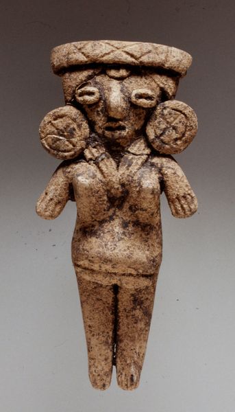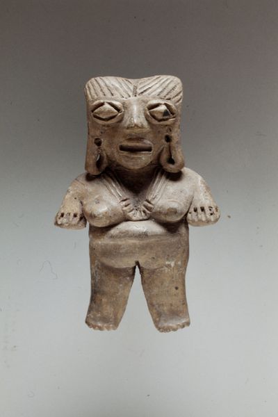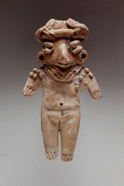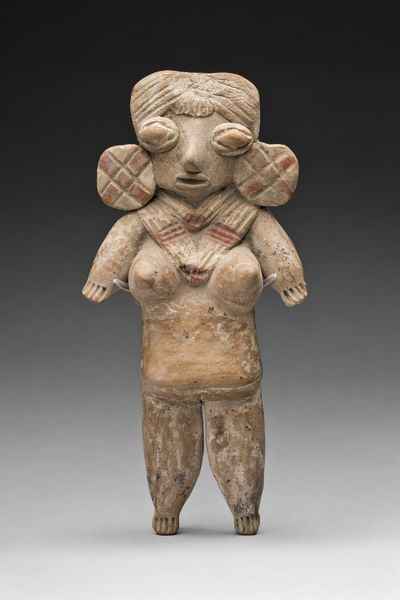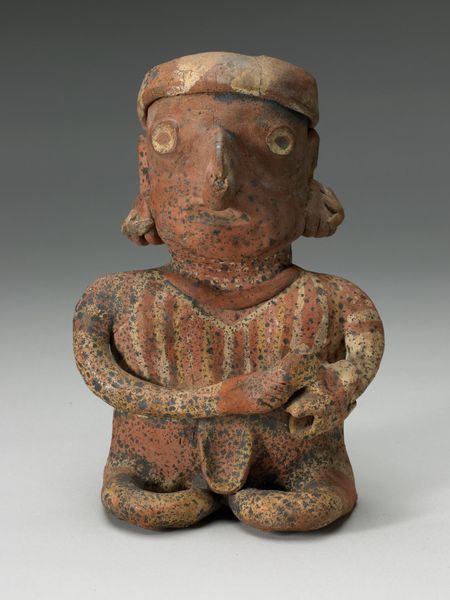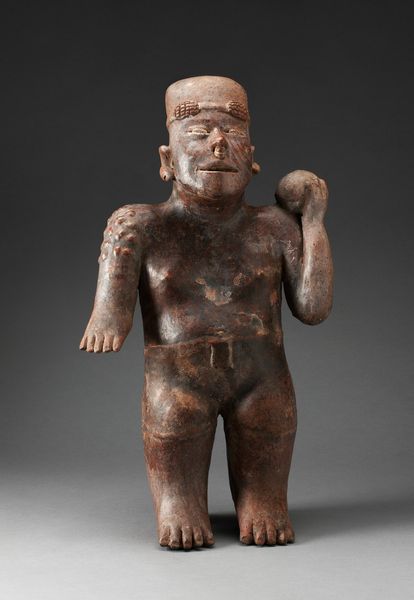 Editor: Here we have the "Ballplayer Figurine," a ceramic sculpture dating possibly from 800 to 1400 AD, created by an artist from Veracruz. I’m struck by how dynamic the pose is. How would you interpret this work? Curator: This figurine offers us a fascinating lens through which to examine the cultural importance of sport and ritual in Classic Veracruz society. The ballgame wasn’t just a game; it was deeply embedded in their political and religious life. What do you notice about the figure's attire and posture? Editor: Well, they have protective gear, like the padded belt and what looks like knee protection. They seem ready for action, maybe mid-game. Curator: Precisely! Consider how the artist has chosen to represent this figure. The elaborate gear and ready stance underscore the player's role, perhaps reflecting social status or a specific ritual function. What social statements do you think this uniform is designed to telegraph? Editor: It’s a bit like looking at a modern athlete, instantly recognizable because of what they wear. The figure projects power and status but in a very different context. Was it common to immortalize athletes in this way? Curator: Such figurines were often used in burials or placed as offerings, indicating the ballplayer’s significance beyond the game itself – maybe their social influence on their community? Editor: It’s incredible how much cultural context is packed into this one small sculpture. Curator: Indeed. By understanding the game's significance, the figurine opens a broader conversation about power dynamics, social rituals, and the intersection of sport and spirituality in pre-Columbian societies.