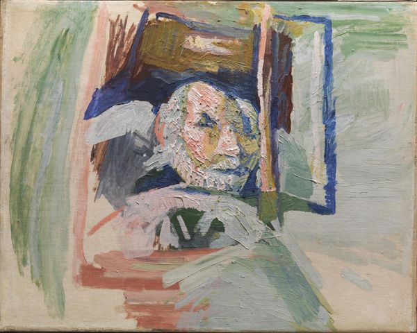 Curator: Richard Diebenkorn’s “Women Outside,” painted in 1957, presents two figures against a striking landscape, rendered in oil paint with visible, textural brushstrokes. Editor: The first thing that strikes me is how immediate it feels. The heavy impasto of the paint application makes the canvas thrum with materiality, like I could reach out and feel the build-up of pigment. Curator: The simplified forms certainly possess an immediacy, even a primordial quality. The juxtaposition of these abstracted female figures with the simplified, almost symbolic landscape…it evokes a very primal, perhaps maternal image, connected to the earth. It seems as though they are guarding it. Editor: Interesting that you see guardians. To me, it’s less about guarding and more about being constructed. Notice how Diebenkorn applied and reapplied the paint in layers. I mean, you can almost chart the labor, the artist’s process, in those ridges. He’s showing us how this image—this concept of “woman”—is built layer by layer through materiality. Curator: But wouldn't you say the lack of intricate detail draws us instead toward universal interpretations? These could be any women, anywhere. This almost archetypal representation emphasizes continuity, evoking female figures across art history, even mythology. Consider Demeter in a field of green... Editor: While those historical allusions are undoubtedly present, let’s not overlook the simple means that bring the subjects to life: layers and layers of pigment that are at the same time quite heavy and ephemeral. How remarkable the texture! This isn't a disembodied archetype. It is materially here, now, constructed by labor. Curator: Perhaps it's both. It's through the application of simple, earthy materials that the universal image comes forth to suggest both timelessness and the here and now. Editor: I am content leaving with an awareness of just how deliberately Diebenkorn built the image that gives us pause today.