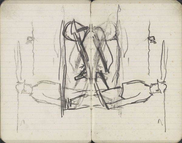 Curator: Welcome. We’re looking at a work by Isaac Israels, titled "Standing Woman, Possibly in Bathing Suit". It’s a pencil and ink drawing that likely dates from between 1875 and 1934. You can currently find it here at the Rijksmuseum. Editor: It looks like a fever dream! I mean that in the best way. The lines are so raw and energetic, it feels like he's captured a fleeting moment, a memory almost dissolving before our eyes. It has that upside-down quality; like when you're a kid hanging off the sofa, looking at the world from a completely different perspective. Curator: That sensation of a dissolving memory is interesting. Israels belonged to a generation of artists attuned to the transience of modern life. His depictions of women are especially insightful when considered against the backdrop of rapidly shifting gender roles at the turn of the century. Editor: Exactly. It’s like she’s caught mid-transformation. Is she emerging from water? From sleep? From a previous version of herself? The pose is almost acrobatic, suggesting both vulnerability and a hidden strength. There's definitely something about her presence; a hint of defiance in this uninhibited display. Curator: We might explore that "defiance" by positioning the work in the context of contemporary debates around female representation and the male gaze. While nude studies have a long history, Israels’ quick, almost secretive sketching suggests a more intimate encounter, rather than a formal, academic exercise. We can interpret the drawing not just as a representation of the female body, but a commentary on the act of observing it. Editor: Well said. It certainly avoids any kind of idealization. The imperfections, the unfinished quality, are all part of what makes it feel so…honest. There’s a refreshing lack of pretense here, as if Israels were more interested in capturing the feeling of being alive than achieving some polished, flawless depiction. For me, it feels more like looking in a mirror than into a painting, capturing both awkwardness and possibility. Curator: It really does push beyond the aesthetic norms to provide valuable social commentary. Its immediacy forces us to reconsider the narratives we impose and appreciate both vulnerability and force, especially as experienced by the women who inspired this piece. Editor: Indeed. It has a curious effect. After close inspection, I think it reveals more about our own projections than Israels' intentions, and ultimately that's why it stays with you long after you walk away from it.