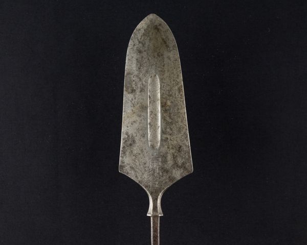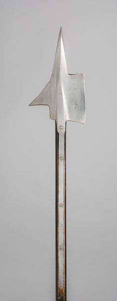 Curator: Here we have a Halberd, dating back to 1500-1540, from the hands of Master BE, possibly Bernadino da Carnago. Editor: My immediate thought? Deadly elegance. That's a weapon crafted with lethal intent, but also, dare I say, artistry? Curator: Absolutely! Notice the way the metal catches the light, it’s almost sculptural. But beyond aesthetics, the halberd represents a fascinating shift in warfare, doesn't it? A weapon carried by foot soldiers capable of unseating a knight. Editor: Exactly, this isn't just a pointy stick. It’s a tool of social and political change! Think about the rise of infantry against the dominance of the cavalry during this period. It disrupts the feudal order, doesn’t it? Levels the playing field, quite literally. Curator: In a brutal sort of way, yes. The design itself speaks volumes, that sharp beak at the back, for hooking riders… that axe blade… Editor: The very shape is performative, a silent proclamation of shifting power dynamics. Metal and wood – tools created to both take and protect lives, it raises fascinating questions around militarism in this historical context, what were the lives of those wielding this tool, what choices did they have? Curator: Do you think there’s almost a beauty in the craft, like maybe that speaks to this period and people in a more meaningful way. Editor: Beauty created during a time of violence and disparity speaks to resilience, yes. Though it also acts as an indictment against inequitable societies, because we must confront not only why this art was created but *how* and for *whom.* Curator: I will agree with you on that point, the history is one we should keep teaching for years to come. This weapon and all that it represents should serve as a symbol of times people want to change. Editor: Indeed, in engaging with such works, it is essential to remember, that in moments of historical introspection, it's crucial to consider our relationship to power, past and present.