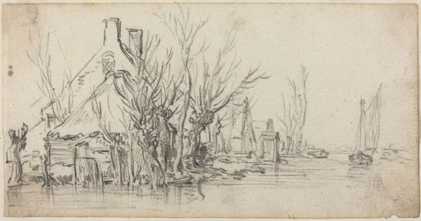 Editor: This is Jan van Goyen's "Cottage by a River," a drawing from around 1627-1629. I'm really struck by how simple it is, almost like a quick sketch, but it perfectly captures this tranquil, rural scene. What do you see in this piece? Curator: Well, first, I see the rising prominence of landscape as a legitimate subject in its own right. Consider the societal context: the Dutch Republic was experiencing unprecedented economic growth and social mobility. People wanted art that reflected their own lives and environment, not just religious or mythological scenes. What's interesting is van Goyen isn't presenting some idealized view of nature; he's showing us a very ordinary cottage, a working landscape. Why do you think this focus on the ordinary was so appealing? Editor: Maybe because it reflected the everyday lives of the growing middle class, making art more accessible and relatable? Instead of grand historical paintings, they could see their own world reflected back at them. Curator: Precisely. And think about the role of institutions in shaping taste. Newly wealthy merchants and professionals became patrons, influencing what artists produced and what museums collected. The Dutch art market was booming, and artists like van Goyen were catering to a demand for landscapes that celebrated the Dutch countryside and the values of hard work and prosperity. It also begs the question of how something seemingly simple reflects a burgeoning sense of national identity, doesn't it? Editor: It definitely does. Looking at it now, it's not just a picture of a cottage; it's a statement about Dutch society and its values at the time. That's a really insightful perspective! Curator: Indeed, this piece underscores the public role of art in constructing and reinforcing cultural values during a critical period in Dutch history.