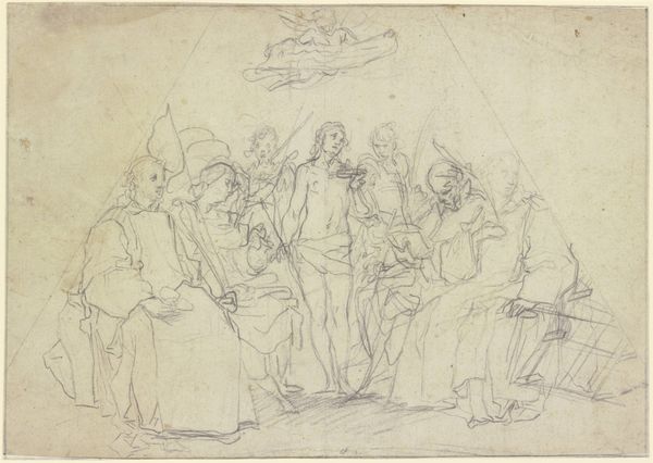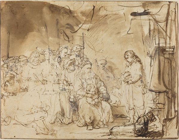 Editor: Here we have Aert de Gelder's pen and ink drawing, "Jacob Shown Joseph's Blood-Stained Coat," created around 1660. I'm immediately struck by how expressive these simple lines are; they convey such a deep sense of grief. What compositional elements contribute most to the emotional weight of this piece, in your opinion? Curator: Observe how de Gelder manipulates line weight and density. Notice the heavier, more deliberate strokes defining Jacob's figure, emphasizing his solidity and emotional burden. In contrast, the figures presenting the coat are rendered with lighter, sketchier lines, conveying a sense of agitated movement and perhaps even deception. Editor: So, the very texture of the lines reflects the characters' emotional states and roles within the narrative? Curator: Precisely. The formal arrangement also guides our eye. Consider the central placement of Jacob, visually anchoring the composition. The directional lines of the outstretched arms lead directly to him, making him the focal point of the accusation. Note too how the relative emptiness behind him contrasts with the cluster of figures around him, thus emphasizing his isolation. Editor: That makes sense. It’s a study in contrasts: solid versus ephemeral, still versus agitated, alone versus together. Curator: Consider further how de Gelder creates depth. Are there sharp angles or is depth created softly? Note the details like clothing or faces: How does this influence the space? Editor: The lines feel deliberate, especially with details like clothing. But I notice a lack of dramatic light and shadow in this work as opposed to a painting. Curator: Quite right, and notice how the lack of tonal variation, combined with de Gelder’s use of hatching and cross-hatching, allows for nuanced modelling and texture without distracting from the overall design. Ultimately, form serves emotion in this captivating drawing. Editor: That close observation of line and composition really sheds light on how the artist makes this scene so emotionally resonant. I hadn't considered how much the materiality of the drawing itself contributes to the storytelling.