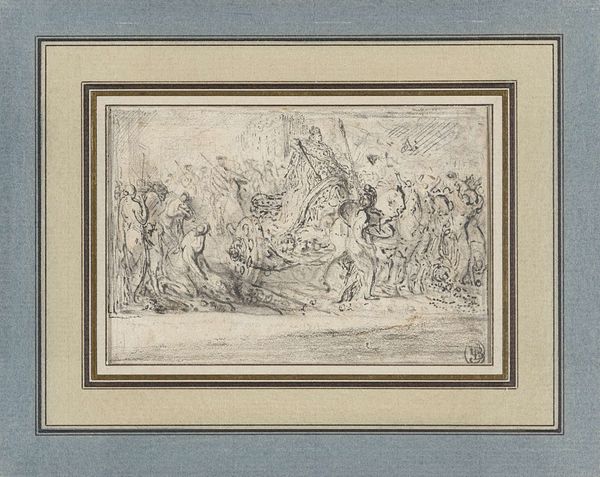 Hendrik Potuyl created this drawing, "Village Merry Company," using pen and brown ink. The composition of the drawing emphasizes the interplay of figures within a loosely defined space. The artist uses line work to define the forms of the figures and their interactions. The use of brown ink creates a warm, monochromatic palette that unifies the scene, while the density of lines varies to suggest depth and shadow. The structural arrangement of the figures invites semiotic interpretation. The grouping of figures around a central point suggests community and shared experience. The linear perspective, though not rigorously applied, guides the viewer's eye through the scene, engaging with each figure. The emphasis on line and form allows us to consider how Potuyl uses the drawing to convey meaning, reflecting a moment of communal engagement through the intrinsic qualities of the artwork.