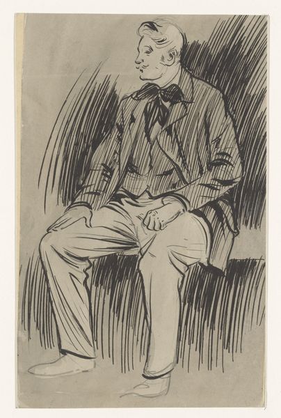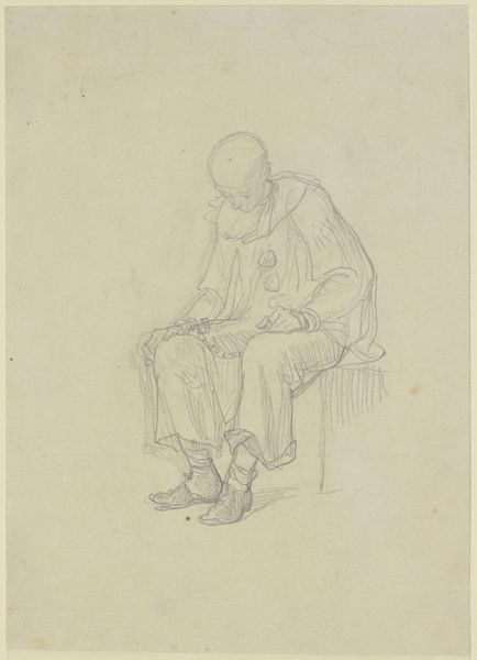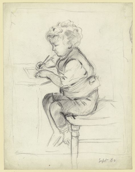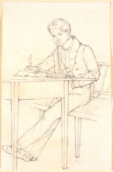 Editor: This pencil sketch, "Schreibender junger Mann in einer Gartenwirtschaft," or "Young Man Writing in a Tavern Garden" by Gustav Schraegle, created in 1888, feels so immediate. I’m struck by how the artist captured this everyday moment with such delicate lines. What's your interpretation of the artwork? Curator: I see a fascinating depiction of labor and leisure. Schraegle's choice of pencil as a medium highlights the accessibility of artistic production at the time. Consider the "gartenwirtschaft," a space blending work and recreation. The young man, seemingly engrossed in writing, occupies this liminal space. What kind of work do you think he is undertaking here? Editor: Perhaps he's a writer, or a student jotting down notes? But I am drawn to the fact that he is sketching in what appears to be, from its German title, a casual or working-class public space rather than a more elevated setting. Does the tavern garden signify something specific about the cultural moment? Curator: Absolutely. Taverns were often spaces of political discussion and social exchange, accessible even to those without private studios. The artist makes the statement that art-making is something embedded within the community, even within the means of a humble pencil sketch. Editor: That’s interesting. It pushes back against the idea of the artist as isolated genius. Seeing this image, considering pencil, paper and the location of this labor makes it suddenly all the more compelling to consider this artwork as less romantic and more proletarian. Curator: Exactly! By using simple materials and depicting an everyday scene, Schraegle subtly democratizes art. The focus shifts from grand narratives to the labor of representation itself. It makes you wonder about the artist’s intention when capturing this moment of creation. Editor: I see what you mean. Thanks to that shift of focus, this pencil drawing resonates beyond a simple portrait to become a commentary on accessibility and the making of art.