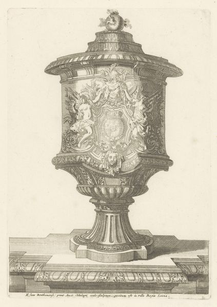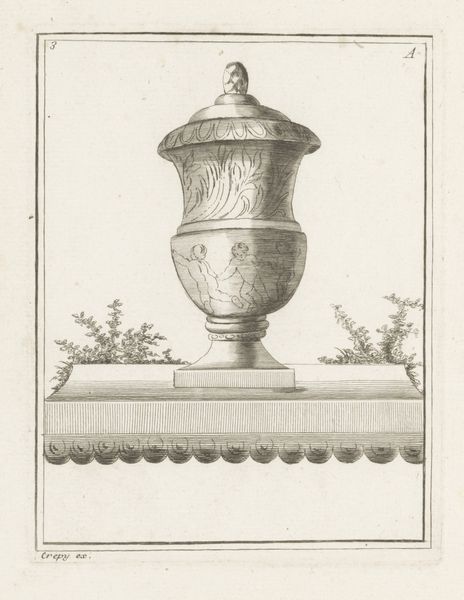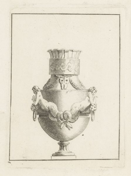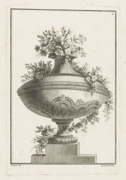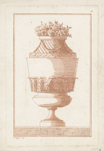 Marie-Anne Rousselet created this print, Vaas met bloemen, around the late 18th century. It depicts a vase adorned with flowers, rendered in delicate lines. This image offers a glimpse into the aesthetic values of its time, where decorative arts held significant cultural importance. Made in France, it reflects the Rococo period's emphasis on elegance and ornamentation. Vases like these were status symbols in aristocratic households, embodying refinement and taste. Rousselet’s choice to depict it suggests a connection to the world of design and craftsmanship, which was becoming increasingly professionalized through institutions like the Royal Academy. To fully understand this artwork, we might delve into pattern books and design manuals of the era. By looking at these resources, we can better understand how images like these circulated and influenced the decorative arts of the time. Art becomes contingent on the social and institutional contexts that shape its creation and reception.