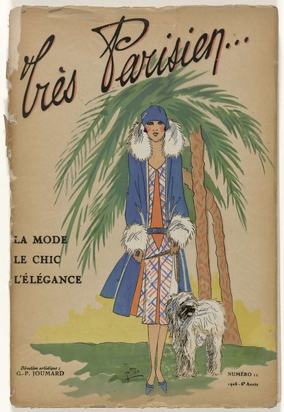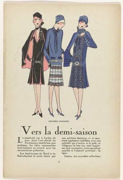 Editor: This ink and watercolour drawing, "Toujours Chic Les Tailleurs et Les Manteaux Hiver 1921-1922" by G-P. Joumard, feels incredibly evocative of its time. It's like a glimpse into a fashionable Parisian world, but there's also something a little detached about it. What do you see in this piece beyond its immediate charm? Curator: I see a carefully constructed image of bourgeois femininity in the aftermath of the First World War. This drawing, as a fashion plate, wasn’t simply about selling clothes. It performed a crucial role in reshaping the image of women and their roles in a rapidly changing society. Consider the bold lines of the outfit – what might they represent? Editor: Perhaps a sense of newfound freedom and modernity? It definitely feels less restrictive than earlier styles. Curator: Precisely! The relatively shorter skirt, the streamlined silhouette – these were visual signifiers of women entering the workforce, demanding greater autonomy. It’s fascinating how fashion becomes a battleground for defining and negotiating these shifting social roles. And what about the title itself, "Toujours Chic"? Who is it speaking to, and what anxieties might it be attempting to soothe? Editor: I hadn’t thought about the "always chic" aspect in that way. Maybe it’s reassuring the upper class that even amid societal changes, they can maintain their status through fashion? Curator: Exactly. It's a quiet assertion of privilege, a way of marking oneself as belonging to a certain social stratum. By buying into this "chic," women could participate in a system that simultaneously offered liberation and reinforced existing power structures. Where do you see that tension most clearly visualized? Editor: Probably in the juxtaposition of the almost rebellious clothing with the poised, somewhat distant figure. There's progress, but within limits, maybe? I never thought a fashion drawing could be so loaded with meaning! Curator: It's a perfect example of how art, even seemingly commercial art, is deeply embedded in its historical and social context. Analyzing it reveals so much about the complexities of gender, class, and the evolving role of women in the 1920s. Editor: I'll definitely be looking at fashion illustration differently now. Thanks for unpacking all those layers!