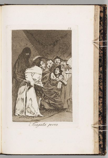 Editor: This etching, "What a Golden Beak!" by Francisco José de Goya y Lucientes, presents a rather unsettling scene. The figures seem grotesque, almost like caricatures. What do you see in this piece that might illuminate Goya's intent? Curator: Considering Goya's context—the late 18th and early 19th centuries—and the sociopolitical turmoil of Spain, this image critiques power structures. The owl, often a symbol of wisdom, is perched above figures who seem to be in positions of authority, yet their faces are contorted, suggesting corruption or foolishness. Does the "golden beak" imply empty rhetoric? Editor: That’s fascinating! I hadn’t considered the owl as a critique of authority. Curator: Goya was deeply invested in exposing social inequalities and the abuse of power. What if this scene serves as a biting commentary on the state of affairs at the time? What did you take away from it? Editor: I see it now, the power of art as a form of resistance and social commentary. Thank you.