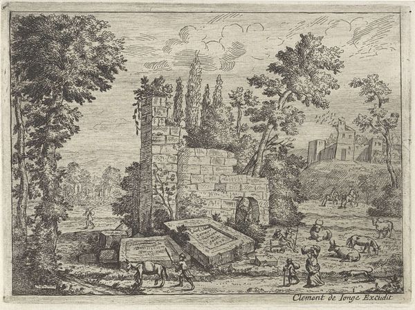 Claes Jansz Visscher created this print, 'Landscape with the Road to Emmaus,' in the Netherlands sometime between 1600 and 1650. It depicts a biblical scene—Christ appearing to two disciples after his resurrection—within a meticulously rendered Dutch landscape. The print reflects the cultural milieu of the Dutch Golden Age, where landscape painting flourished alongside religious and genre scenes catering to a prosperous merchant class. Visscher capitalizes on the period’s taste for detailed realism; note the imposing architecture, the trees that frame the composition, and the figures in conversation. Yet, it also subtly incorporates religious narrative within this burgeoning secular style. To truly understand this work, we can research the cultural values of the Dutch Republic, the role of religious art in a Protestant society, and the rise of landscape as a distinct genre. Such inquiries would reveal the complex interplay between faith, commerce, and artistic innovation in the early modern Netherlands.