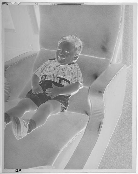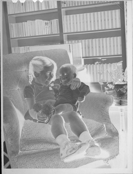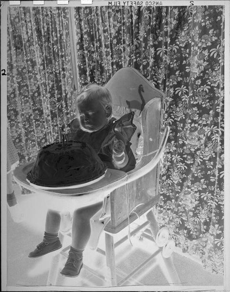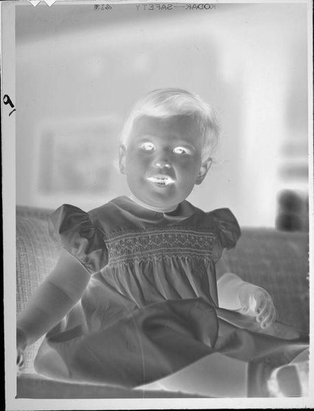 Editor: Here we have an intriguing gelatin silver print by Lucian and Mary Brown, simply titled *Untitled (baby being held up in air)*. It feels so intimate, yet the inverted tones are unsettling. What strikes you about this piece? Curator: For me, it's about the labor inherent in photographic processes and the social dynamics of portraiture. The Kodak film markings along the top edge remind us of the industrial production involved. What does it mean to capture and freeze a moment of such tenderness, and then reproduce it? Editor: That's fascinating! I hadn't considered the act of reproducing it. Curator: And notice the arm holding the child. The wristwatch situates this image within a specific era of material culture and speaks volumes about labor, leisure, and the performance of domesticity. It compels me to ask, who is holding the baby, and what is the division of labor here? Editor: Now I see so many layers within this seemingly simple photograph! Thank you!