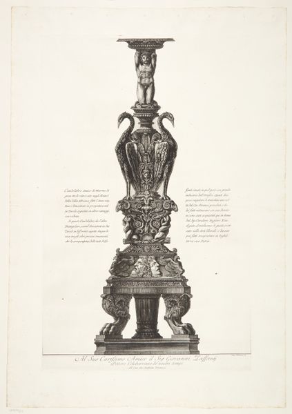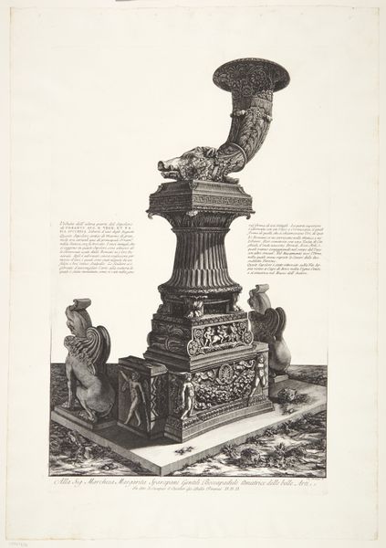 Curator: Looking at this print, my first thought is that it looks like it’s looming. The sheer scale conveyed is overwhelming. Editor: Indeed. We’re looking at "Another view of the same vase as depicted in the preceding etching, seen from below", an engraving by Giovanni Battista Piranesi, created between 1769 and 1778. It's part of the collection here at the SMK. Piranesi really captured the grandeur of the baroque style. Curator: It’s certainly imposing, the low viewpoint exaggerating its size. Notice how Piranesi used extremely precise linework, emphasizing the sculptural details and giving a sense of monumentality. The play of light and shadow adds dramatic intensity. Editor: And Piranesi's focus wasn't just aesthetic. He was actively involved in debates about Roman architectural superiority. Prints like this contributed to a burgeoning public discourse around national identity and cultural heritage. These weren't just beautiful objects; they were political statements. Curator: I'd agree. The vase is clearly the primary focus here, dominating the visual space. And while historical context enriches our understanding, the artist’s careful structuring of the artwork— the proportions, the use of perspective— these elements contribute equally to its profound aesthetic impact. Editor: Precisely, but that aesthetic impact also functions as a sort of cultural propaganda, shaping public perception of Rome’s significance. By glorifying the artifacts, Piranesi promoted a specific narrative about the past. Curator: Perhaps. It’s undeniable that this viewpoint and treatment elevate a utilitarian object into something that’s sublime. The ornamentation itself is highly articulate, note the floral detailing, figures… Editor: Right. He made sure the vase’s role as a status symbol remained apparent, showcasing Rome’s opulent tastes for a wide audience that would mostly see this masterpiece rendered through prints like these, a means for distributing propaganda in the Age of Enlightenment. Curator: Whether intended for propaganda or not, his technical virtuosity remains stunning. Ultimately, Piranesi compels us to reflect on art’s capacity to communicate, provoke, and simply inspire. Editor: Agreed. His work, particularly pieces such as this, shows how art history is never solely about "beauty." Art is fundamentally tied to society, culture, and, as you suggested, to how the cultural narrative inspires our way of seeing and being in the world.