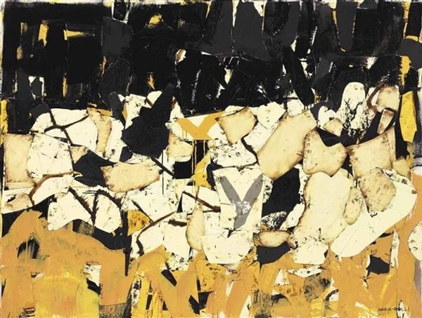 Editor: We're looking at an untitled mixed-media piece by Karl Otto Gotz from 1954. The strong contrast in black and white, and the chaotic lines, give it a very dynamic and almost unsettling feel. What do you see in this work from a formalist perspective? Curator: From a formalist standpoint, I find the most compelling aspect to be the interplay between form and the void. Note how Gotz has masterfully orchestrated a dynamic composition using a restricted palette. The monochrome enhances the dramatic effect of gestural marks; we observe a network of lines, smudges, and splatters interacting across the picture plane. The lack of defined subject matter forces us to engage with the artist's manipulation of material and surface. What structural relationships can you identify in the composition? Editor: I see how the thick, bold black strokes create a sense of weight, anchoring the composition, while the delicate white lines introduce movement and airiness, suggesting layers of depth despite the flatness of the canvas. The contrasting values and textures create tension. Curator: Precisely. Now, consider the use of semiotics: can we consider how these pictorial marks represent something beyond themselves? Can we decode an underlying meaning within this visual language, if meaning is indeed something stable? What signs, what metaphors can we deduce from its formal construction? Editor: I think the beauty of this piece is its inherent ambiguity. Its lack of representational form is both liberating and unsettling, but forces us to actively construct our meaning from line, form and texture. I guess it resists any singular interpretation? Curator: Indeed. And that, perhaps, is where its power resides. Understanding the intrinsic visual rhetoric, beyond immediate emotional responses, unlocks the nuances of its artistic merit. Editor: I'm starting to see how focusing on those formal qualities really deepens my appreciation for it. Thanks for your insight!