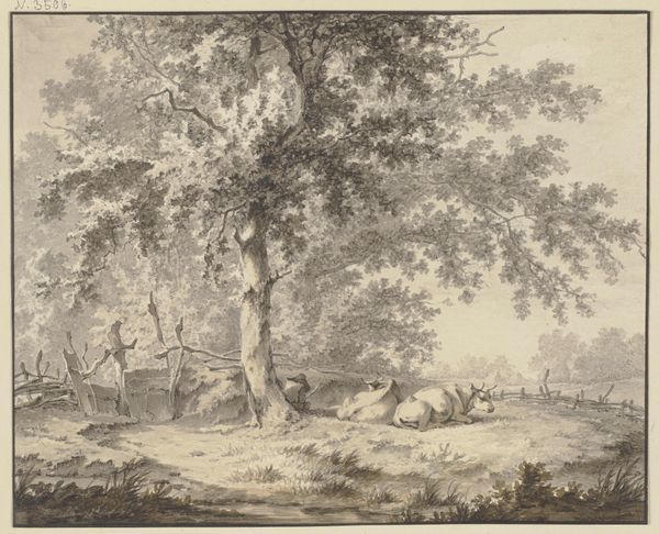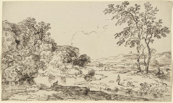 Karl Schutz made this drawing, "Forest, Valley and Distant Hills", sometime in the late 1700s with pen and brown ink, and gray wash, over graphite on paper. The materials themselves are quite traditional for the period. Paper was becoming more readily available, but still precious, a ground on which an artist could develop their skills. The layered strokes of the pen create depth and texture, the way the ink bleeds into the paper helps to create tone, and the way the gray wash has been applied adds atmospheric perspective to the landscape. Looking at this image, it is important to consider the amount of hand work required to create such a drawing. Each stroke is a conscious decision made by the artist, requiring time, skill and patience. In a time before photography, drawings like these were a crucial means of documenting and understanding the natural world. This beautiful drawing reminds us of the value of time, skill and process in understanding and appreciating works of art.