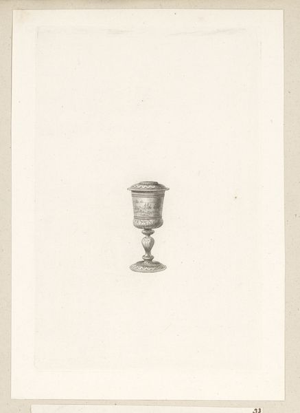 Editor: This is 'Wijwateremmer', or Holy Water Bucket, an engraving from after 1784 by an anonymous artist, currently housed at the Rijksmuseum. I find the precision and detail of the lines really striking, giving it almost a photographic quality despite being an engraving. How do you read this print? Curator: The piece presents a study in form and balance. Notice how the engraver contrasts the smooth, fluted lines of the bucket's body with the ornate garland detailing. The weight distribution is also crucial: the robust base, decorated with stylized leaves, provides a visual anchor to the delicate handle. Do you observe any disharmony between these design elements? Editor: I hadn’t considered the disharmony before, but now I see a bit of tension. The base feels so heavy and botanical, while the top feels lighter and more geometric. Curator: Precisely. This tension isn’t necessarily a flaw but an element that encourages further consideration. Note also the use of light and shadow achieved solely through line variation. This careful modulation gives the object a tangible, three-dimensional presence on a two-dimensional surface. What implications do you derive from that? Editor: It gives such volume. It feels weighty even though it's just lines on paper! I am impressed. Curator: And this technique invites us to consider how graphic art can successfully emulate the material qualities of sculpture and metalwork, purely through manipulation of form. The piece prompts examination into the nature of representation. Editor: I now see the piece’s beauty in the tensions and balance, and in how its artifice allows me to focus on this particular holy water bucket’s presence as both symbol and thing.