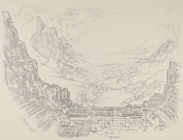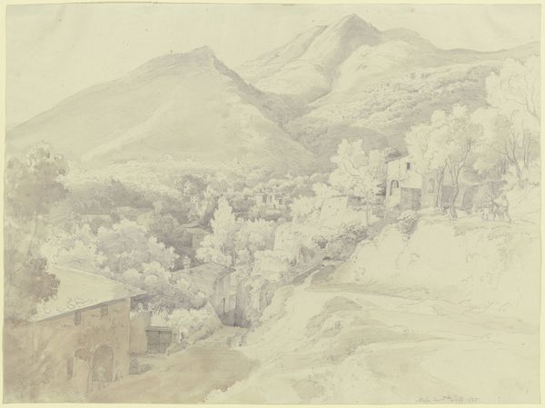 Curator: What strikes me immediately about this pencil sketch is the delicate, almost ethereal quality of the lines. There's a lightness that evokes a sense of peace. Editor: Indeed. We are looking at "Gezicht op Capri" – View of Capri – created around 1830 by Jacobus Everhardus Josephus van den Berg. This drawing captures a sweeping vista, typical of the Romantic era’s fascination with landscape. Curator: The composition is particularly interesting. The artist uses a subtle, almost tonal approach, building up forms with very light pencil strokes. Note how the eye is led from the foreground rooftops up to the distant mountains, creating a deep sense of space. The mountains themselves, outlined almost imperceptibly, evoke a sense of grandeur, wouldn't you say? Editor: Yes, and it’s crucial to understand the context. The early 19th century witnessed a rise in the Grand Tour phenomenon, where artists like Van den Berg travelled to picturesque locations like Capri. This drawing would've been viewed less as a finished work and more as a record, a kind of visual souvenir, and a reference point for future studio paintings. It reveals a European elite shaping their worldview through art and travel. Curator: I find the precision compelling, even in its subtlety. Consider the detailing in the buildings, or the way the artist suggests foliage with just a few strokes of the pencil. There's an impressive control over line and tone to achieve this realistic depiction using simple techniques. Editor: I agree that Van den Berg showcases skillful handiwork, but the very act of sketching the picturesque also played a part in framing Capri itself for future travellers, thus perpetuating a very specific view of Italy. Curator: That’s a salient point, reminding us that even the most seemingly straightforward depictions of landscape can be ideologically charged. Thank you. Editor: It is vital that we delve behind such attractive images, considering whose version of reality has become art history. Thank you for sharing your keen observations.