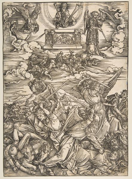 Curator: Look at this fascinating woodcut titled "The War with Venice, from The Triumphal Arch of Maximilian I," created between 1515 and 1517. My immediate impression is of overwhelming energy, an incredibly active composition despite the static medium. The density of figures and the sheer linear detail… it's captivating, if somewhat claustrophobic. Editor: Indeed, a maelstrom rendered in miniature. One sees immediately the artist is aiming to showcase the military might and, implicitly, the political aspirations of Maximilian I. The print forms part of a larger propagandistic project designed to establish the emperor's legacy, projecting power and authority. It's all about crafting the narrative. Curator: The meticulous rendering of the armor, weapons, and even the city in the background contribute to this. Observe the incredible textures achieved through simple lines. The way light and shadow play across the battlefield is masterful in creating depth, despite the relatively flat perspective. Editor: And note the symbolism imbued in the flags, emblems, and the very architecture. The "Triumphal Arch" itself is designed as a cultural artifact laden with imperial ideology. Each element strategically placed to broadcast messages of strength and legitimacy during a particularly turbulent period of Venetian-Habsburg relations. Curator: Precisely. Focusing on the formal qualities, consider how the composition is structured – layers upon layers pushing the eye back to the hazy landscape above. All those diagonals create an incredibly dynamic, almost unsettling experience, that clashes with the grounded horizontals above and below, confining all of this frantic movement. Editor: The aesthetic, in this context, reinforces the historical narrative. Maximilian wasn't simply winning battles; he was solidifying an image. And in commissioning artworks like this for wide distribution via prints, it created not just an aesthetic impact, but very real sociopolitical ones, as images of rulers began to disseminate across society like never before. Curator: Thinking about it now, those formal constraints, so perfectly constructed, mirror Maximilian’s political control, doesn’t it? Fascinating! Editor: Absolutely. By analyzing it this way, we unveil some important and fascinating dimensions, looking beyond aesthetics into socio-political ramifications.
