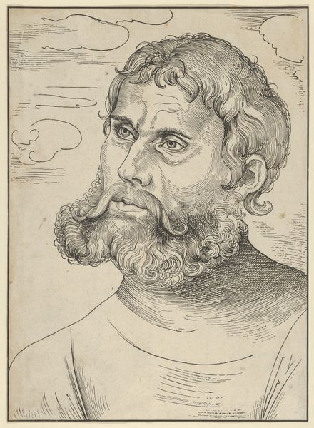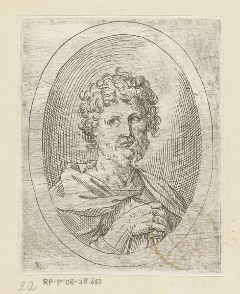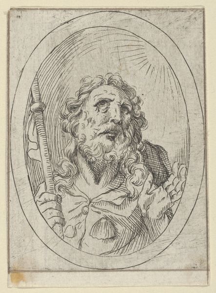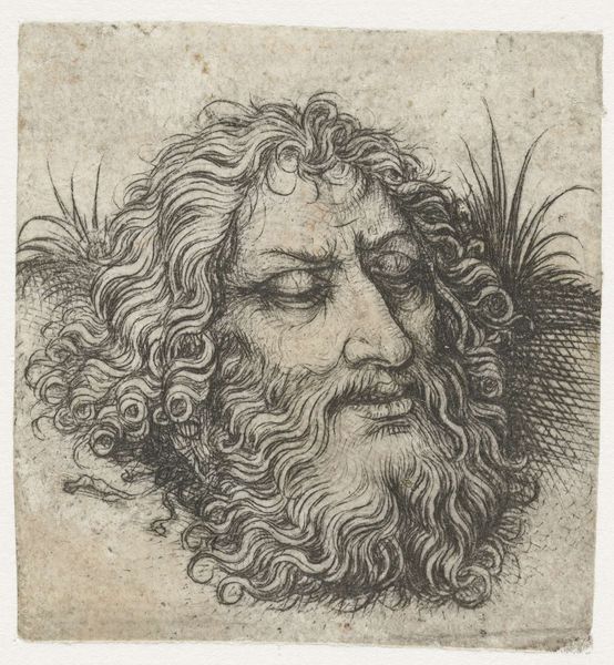 Curator: Here we have "The Head of John the Baptist on a Platter," an engraving completed between 1485 and 1490 by the Master of the Amsterdam Cabinet. Editor: Striking. There's a raw intensity to the image, especially in the detailed linework depicting the hair and beard. The presentation on the platter creates an unnerving sense of immediacy. Curator: Indeed. The artist's use of line, specifically, is masterful in defining form and texture. Note the varied weight of the lines—they create a dramatic chiaroscuro effect despite the absence of color. It allows for a powerful, albeit stark, depiction. Editor: From a historical perspective, images like these often served didactic purposes, reminding viewers of the price of righteousness and the dangers of opposing authority. Considering the prevalence of religious and political turmoil in that era, such imagery reinforced social control. Curator: Perhaps. Though I also see a meditation on the body, and its symbolic form. Observe the flatness of the platter juxtaposed with the dynamism of the figure—it is like a prison or frame, creating tension, through shape and form. Editor: It makes me think about the social and cultural value that the medieval people attributed to religion, it also evokes an image of ritual violence; a spectacle presented for a privileged audience who could, then, spread a social or political message. Curator: Precisely. A deeply unsettling commentary conveyed through a precise, yet strangely beautiful, application of line. Editor: An enduring testament to art's capacity to engage with themes of power, faith, and human fragility across centuries. Curator: And through careful formal consideration, to amplify their emotional resonance.