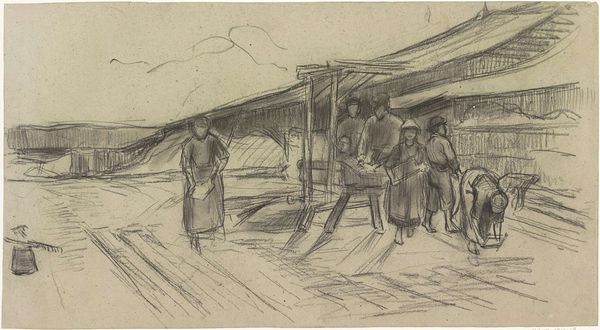 Editor: So, this etching is called "Wheelwright" by James McNeill Whistler. The scene depicts laborers inside a workshop, and the lines really emphasize the grit and hard work. What’s your take on it? Curator: It’s fascinating to consider Whistler, often celebrated for his aestheticism, depicting such manual labor. The etching process itself, the biting of the plate, mirrors the harshness of the work. How does Whistler elevate this scene, moving it beyond mere documentation of labor? Editor: Maybe by showing the beauty in their process, in the repetitive nature of crafting wheels. Curator: Exactly. It challenges the traditional hierarchy that separates ‘fine art’ from the more hands-on crafts. It makes you think about the value of labor, doesn’t it? Editor: It really does. I'll definitely look at etchings differently now!