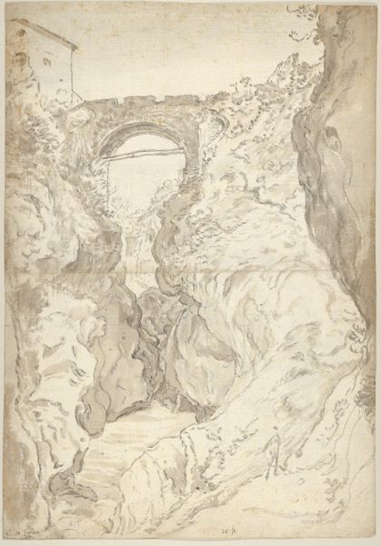 Editor: So, here we have Hans Baldung’s “A deep gorge with a rushing stream at the bottom,” created sometime between 1500 and 1549. It’s a charcoal drawing on paper. What I immediately notice is the way the artist uses line to convey such immense depth and volume – there's a real sense of drama. How do you interpret this work, particularly the use of such a seemingly simple medium? Curator: The apparent simplicity is precisely where the symbolic weight resides. Landscape, especially in this period, becomes a mirror reflecting inner turmoil and the sublime power of nature, often embodying spiritual or psychological states. Look closely – does this gorge not resemble, in some way, a chasm in the psyche, a confrontation with the unknown? Editor: That's fascinating. It didn’t strike me that way at first, but now I see that the way the gorge almost seems to swallow the light hints at a psychological darkness. How would this kind of imagery connect with the cultural anxieties of the Renaissance? Curator: Consider the Reformation, the plague, and a general sense of uncertainty; the craggy rocks could symbolize resilience in the face of adversity. Water is, of course, often a symbol of both cleansing and chaos. Here, it is ‘rushing,’ powerful, carving away the landscape. It begs the question: what is being eroded away here, literally and figuratively? Editor: That connection to erosion – physically and perhaps morally – really deepens my appreciation. The drawing is not just a picture of a landscape; it's a statement about transformation and the forces that shape us. Curator: Exactly. It invites us to reflect on how these symbolic landscapes speak across time, echoing through personal and collective consciousness. The memory of our vulnerability to natural forces, the human condition… Baldung's gorge captures something universal. Editor: I never thought a drawing of a landscape could hold so many layers of meaning! It's changed how I’ll approach interpreting art.