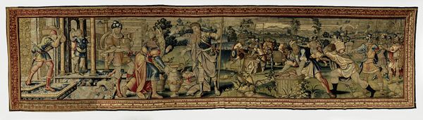 Editor: Here we have a woven tapestry, "The Combat of Manricardo and Zerbino from a set illustrating Ariosto's Orlando Furioso," made sometime between 1630 and 1650 by Raphaël de La Planche. It's such a dynamic scene, full of figures and horses, yet there’s something almost theatrical about it. What's your interpretation of this work? Curator: This tapestry offers a powerful glimpse into the visual culture of its time. While ostensibly depicting a chivalric romance, it's crucial to unpack the power dynamics inherent in these narratives. Notice the central female figure. Is she a damsel in distress, or does her positioning suggest a more active role within this conflict? The context of *Orlando Furioso* as a popular Renaissance epic is key here. Consider how the tapestry translates, and perhaps even subverts, the epic's themes of love, war, and madness through the lens of gender and class. Who would have commissioned such a piece, and what ideologies were they hoping to promote through its display? Editor: That’s fascinating. I hadn't really considered who it was for, but thinking about the patronage definitely changes the way I see it. It makes me question the idea of simple storytelling, as maybe there are agendas at work. Curator: Exactly! The decorative arts were rarely simply "decorative." Tapestries like this often served as potent signifiers of status and vehicles for disseminating particular social and political values. Think about the skilled labor involved in weaving such a piece; it highlights issues of class and access as well. By examining these elements, we can uncover the complex intersectional narratives woven into the fabric of this artwork. How does knowing this shift your perspective on the 'theatrical' quality you initially observed? Editor: It makes the performance seem even more calculated. Everything, even the landscape, seems to be performing a specific function for the audience and the patron. I am understanding tapestries differently now, as being cultural records that embody so many complexities. Curator: I agree. Art is so interesting as long as we continue to question it.