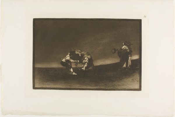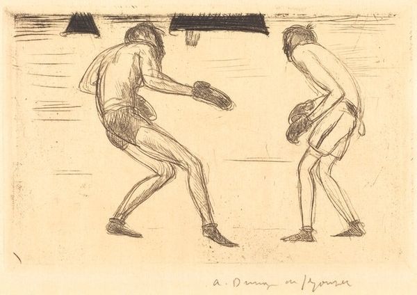 Editor: This is George Bellows' "Dempsey and Firpo," a stark lithograph depicting a brutal boxing match. I'm struck by its raw energy. What does this print reveal about the culture of its time? Curator: It’s fascinating to consider the labor involved in both boxing and printmaking. Bellows wasn't just capturing a spectacle, he was participating in a specific mode of production tied to the era's fascination with physicality and mass media. Note the distribution of light and shadow; it evokes the working class environments where such fights were common entertainment. How does the medium itself contribute to the feeling of grit and immediacy? Editor: It’s like the lithographic process mirrors the physical exertion in the ring, a sort of transfer of energy from the artist to the stone, then to the paper. Curator: Precisely. Considering the social context alongside the artistic process unlocks deeper meanings within the image.
