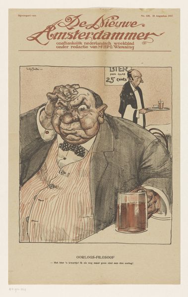 Jan de Waardt made this drawing, Kapitalist, with pen, ink and watercolour. The artwork likely comes from the Netherlands, in the late 19th century. The caricature depicts a portly man in a white suit, smugly stepping over bags of money, an embodiment of capitalist excess. The image derives meaning from its Dutch cultural context, where economic disparities were growing, and anxieties about the power of the wealthy were on the rise. De Waardt was working at a time when social commentary through caricature was a potent form of critique, often published in newspapers and journals. The Rijksmuseum, as an institution, plays a role in preserving and interpreting such works, offering insights into the social and political climate of the past. To fully grasp the cartoon's impact, you would have to research the popular press of the time, studying how such images shaped public opinion. This kind of investigation reminds us that art doesn't exist in a vacuum; rather it is an active participant in ongoing debates about social and political values.