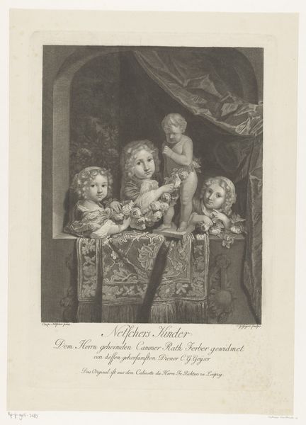 Curator: Johann Georg Wille's print, "Young Instrument Player," presents a vignette viewed as if through a window. Note the delicate rendering of light and shadow. Editor: It’s quite charming. The plate's stark lines give it a certain rustic feel, like a well-worn engraving passed between many hands. I am interested in the process by which this was made. Curator: Precisely! The composition divides neatly into foreground and background, with the figures framed by the arch. This creates a compelling sense of depth. Editor: And consider the labor involved in the printing process. The social position of Wille certainly affected the work's reception and distribution. Curator: Indeed, the print embodies visual refinement. The very lack of color heightens our attention to the details of form. Editor: I agree. The work prompts one to reflect on the historical context of its production. Curator: It’s a fascinating glimpse into another era. Editor: Absolutely. It makes me think about the historical methods of production.