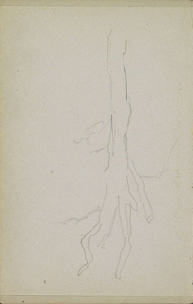 Curator: This pencil drawing is titled "Bomen," which simply translates to "Trees," and was created by Jozef Israëls sometime between 1834 and 1911. You can find it here at the Rijksmuseum. Editor: Immediately, the rawness strikes me. The lines are so delicate, almost tentative, yet they convey a sense of towering, silent presence. There's a real stark beauty in its simplicity. Curator: Israëls was known for his depictions of peasant life and landscapes, often focusing on themes of poverty and resilience. While this drawing isn't as overtly political, I think it still reflects a connection to the natural world and, perhaps, a comment on the resources that were available for making art, that these humble means carry just as much meaning. Editor: Interesting perspective. I see the lines as being less about conveying hardship and more about capturing the essence of the trees' form. The artist seems primarily concerned with the structure and the way light might play across the trunks, despite the lack of color. It is an aesthetic exercise, a way of visually understanding this landscape. Curator: But doesn’t the medium itself, a simple pencil on paper, speak to a certain economic reality? Fine art supplies, were available, of course, but were reserved for more formal pieces that could provide economic return. I mean, there's an intimacy and a directness that comes from using readily available, perhaps even discarded materials. Editor: Possibly, but look at the deliberate layering of the pencil strokes, and the varied pressure creates depth, and a sense of texture, I think that even without any material wealth to bare, Israëls focused less on economics and more on composition—he transforms an ordinary study into something quite ethereal, transcendent even. Curator: And who had access to see, value and collect these more intimate impressions by Israëls, and how does it speak to his larger artmaking economy at the time. It certainly makes one think of this drawings journey to the institution. Editor: Ultimately, this image is something raw and affecting. There’s a lot that the image suggests regarding landscapes that seem quite intentional to me as a formalist. Curator: For me, the artwork speaks of the resources accessible at the time, with this minimal toolkit of pencil and paper speaking of the humble position in which Israëls could produce works like these.