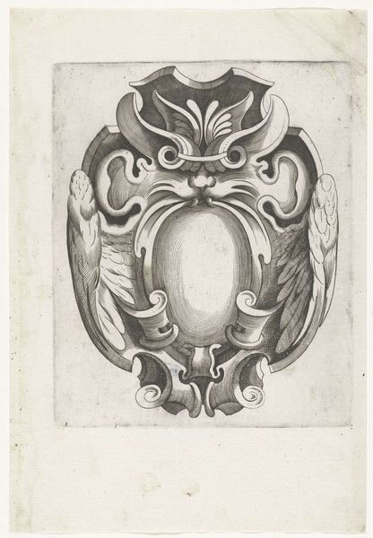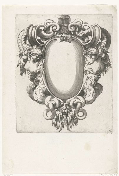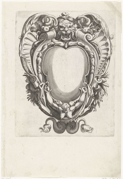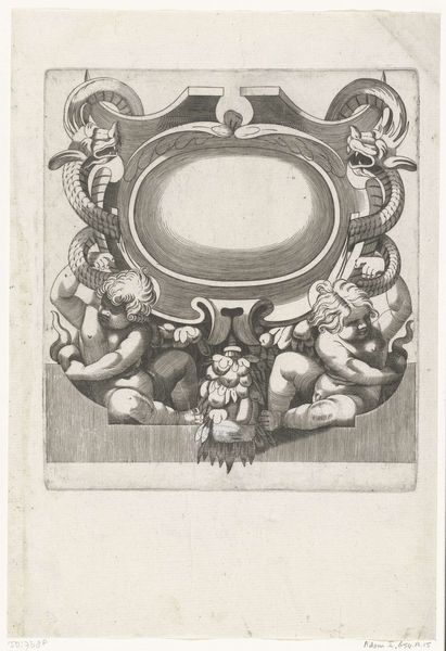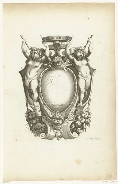 This is 'Cartouche flanked by two children', an engraving by H. Picart. A cartouche is an ornamental frame, and here it is presented with a distinct emphasis on cherubic figures. These figures, often associated with innocence and purity, were also used to convey messages of power and prestige. Picart’s choice to flank the cartouche with children holding trumpets introduces themes of heraldry and announcement. Consider how this imagery might resonate within the context of its time, particularly regarding societal expectations around youth, gender, and class. The cherubs, idealized and nude, evoke classical notions of beauty and virtue. This engraving operates within a visual language of symbolism and allegory, and it invites us to consider the dynamics of representation and the power of visual codes in shaping cultural values.