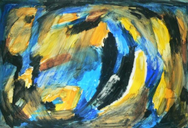 Curator: Up next, we have an untitled acrylic painting by Luigi Guardigli, seemingly aligned with abstract expressionism. Editor: Immediately, I’m drawn to how contained yet expansive it feels. Like peering into a hidden grotto where the water is dark, but some radiant source casts its glow in the distance. Does that make sense? Curator: It does. I’d add that the dynamism is remarkable, considering the limited palette. Notice how Guardigli contrasts bold blues with earth tones and the aggressive black strokes – acrylic lends itself well to such emphatic mark-making. It gives this form. Editor: Precisely, and the size has an impact. The blues are deep, resonant, a sort of emotional plumbing if I may say so, that sucks you right in. Is this just lines on the page? Curator: It is. Abstract expressionism has an effect, stemming partly from the economic conditions of post-war society: disposable income, the boom in available artists' supplies and paints, plus the growing support network of art education that encouraged individuals to move from the canvas sitting in the easel into much larger works. This is quite bold, compared to older styles. Editor: I guess it's a shift toward abstraction as pure emotive power rather than simple aesthetics. And something that comes only from experience. Curator: Absolutely. By engaging directly with new industrial mediums, artists can speak for and affect shifts in socioeconomic structure through art and cultural exchange. Editor: It truly invites one to question, feel, rather than passively observe. Curator: Ultimately, this piece, and the broader abstract expressionist movement, asks us to look closely at how production shapes artistic expression. It has been a real treat getting to spend some time looking more at the intersection of art, culture, and economy here! Editor: And I am left full of hope at this possibility that art is what is possible with material! Amazing.