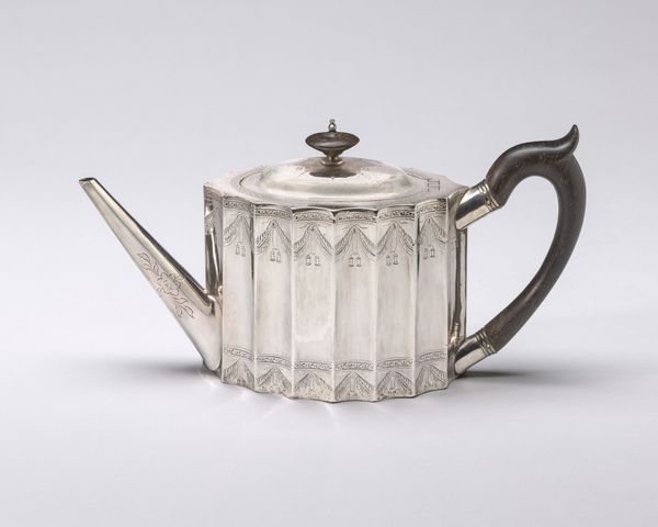 This "Teapot and Stand", crafted by William Vincent, showcases a delicate dance of symbols and societal rituals. The fleur-de-lis motif, circling the teapot, originates from ancient heraldry and royalty, blooming across varied terrains—from medieval banners to modern emblems—evoking nobility. The teapot itself, elevated on a stand, transcends mere functionality; it becomes a stage for social rituals, a silent witness to gatherings, and a vessel of warmth and comfort. Like the symposium vessels of ancient Greece, this teapot hints at a sophisticated culture of conversation and contemplation. Note its reflective surface, which hints at our deep human longing for status, as shiny objects throughout history have signaled prosperity. The reflective metal engages viewers, drawing us in to reflect not just on the object itself but also on our societal values. In its serene presence, we perceive echoes of a bygone era and the timeless interplay between form, function, and the human spirit.