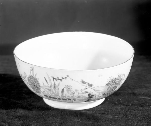 Editor: We’re looking at a ceramic bowl, likely dating back to around 1800, by Eiraku Hozen. The detailing is incredible, like a miniature world painted onto a simple form. It has that kind of meditative quality that makes you pause. What do you see in this piece that I might be missing? Curator: Missing? My dear, seeing art is less about missing and more about discovering. Look at how the external flora—those meticulously rendered chrysanthemums and bamboo—contrast with the minimalist interior where solitary cranes stand. For me, that space *inside* evokes such a yearning...perhaps for tranquility. Editor: I get that, definitely! The cranes seem almost ghostlike against the stark background. It makes the floral design on the outside seem even busier. Almost chaotic, in comparison. Curator: Precisely! A delicious tension, isn't it? Hozen wasn't merely decorating a bowl; they were conjuring an atmosphere. Think about it: a single object, both lavish and serene, humble and masterful. Makes you question the utility of art itself, doesn’t it? Is beauty a distraction, or a doorway? Editor: That's... a lot to think about over a simple bowl! But I see what you mean. It’s about more than just holding something; it's about holding a whole world of ideas. I'll definitely never look at decorative art the same way. Curator: Good! Never take surfaces at face value. Poke around, question the artist, even if they’ve been gone for centuries. Art, after all, thrives on our endless interrogations.