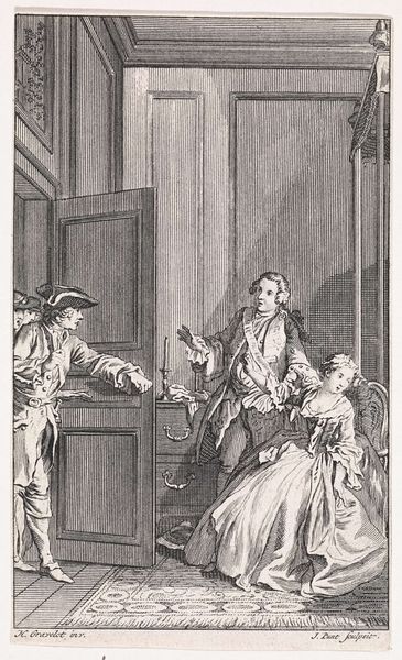 Editor: This engraving by Jan Punt, titled "Man en vrouw in duel met degens" from 1740, depicts a rather theatrical scene. The figures, poised with their swords, appear almost as if performing. What symbolic weight might this staged duel carry, beyond just a simple representation? Curator: It’s a fascinating snapshot of the 18th century. Dueling itself was deeply symbolic – a highly ritualized performance of honor and social status. Notice how the figures are dressed. Consider their clothing: do they reveal more than just social standing? What expectations do we bring as we consider gender, status, and potential violence? Editor: I see that the costumes are extravagant and suggest wealth. Does that extravagance indicate the superficiality of the duel, or perhaps the high stakes involved? Curator: The high stakes are certainly present; their attire speaks volumes about a rigid social hierarchy, yet perhaps hints at a blurring or transgression of its lines. Duels were, after all, forbidden but not uncommon. Editor: So, the image captures both adherence to and subversion of social norms, playing out anxieties through these gendered roles in this formal dance? Curator: Precisely. We see a culture grappling with ideas of class, honor, and gender roles – a cultural memory encoded within the image. Does that give you some interesting perspective? Editor: Yes, understanding the ritualistic aspect helps to interpret it beyond just a simple fight, more like a coded statement on social power dynamics. Thank you. Curator: It's been a pleasure exploring its symbolic landscape with you.