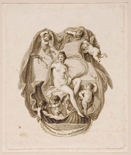 Curator: Look at this engraving, "The Nymph Erigone," by Johann Gotthard Müller. The print depicts a reclining nude figure within an oval frame, reaching for grapes. Editor: She seems totally at peace, but there's also something unsettling about her pose and the slightly claustrophobic feeling of the oval. The grapes give it a Bacchic undertone, doesn't it? Curator: Indeed. Müller, who lived from 1747 to 1830, was a prominent engraver who often reproduced paintings. This one relates to themes of wine, fertility, and transformation in classical mythology. Editor: I wonder about the power dynamics here. Who is gazing, and who is being gazed upon? Erigone's story is one of suicide and despair, so is this a romanticizing of trauma? Curator: It's a complex question. The dedication at the bottom suggests a patron, shaping the work's meaning and reception within a specific social context. Editor: Right, the act of patronage and how that affected the work... It's a glimpse into the art world of the 18th century. Curator: Exactly. The image, beautiful as it is, acts as a window into the social and artistic norms of its time.