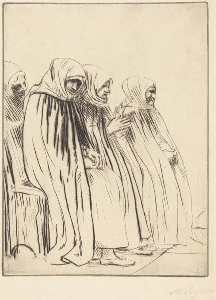 Théophile Alexandre Steinlen created "La Gloire" using what looks like graphite and crayon on paper. Created during a time of immense social upheaval and political tension in France, it's hard not to see the impact of events like the Franco-Prussian War on the artist’s vision. The drawing depicts four women in mourning around what is likely the body of a fallen soldier. The title, “La Gloire,” meaning “Glory” in French, creates a bitter irony, contrasting the supposed glory of war with the intimate grief of those left behind. The faces of the women are marked by deep sorrow, each expressing grief in her own way. The presence of a young girl among the mourners underscores the intergenerational impact of conflict, highlighting the loss of innocence. Steinlen's own socialist leanings and focus on the lives of ordinary people, challenges traditional, heroic narratives of war. It's a statement on the profound human cost of conflict, asking us to reflect on whose stories are told and whose are often overlooked in grand narratives of glory.