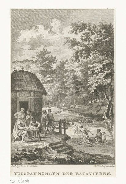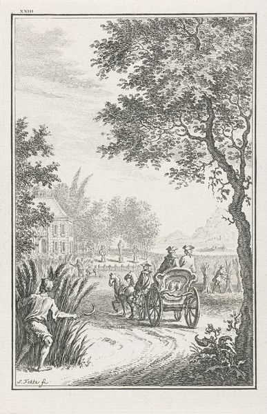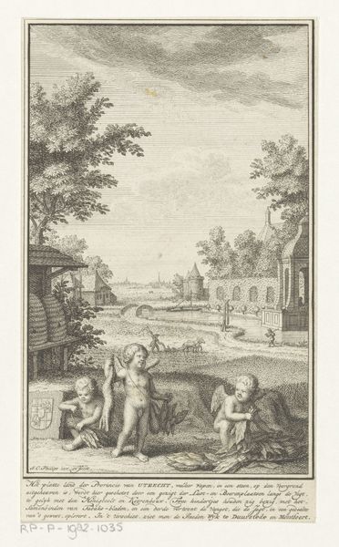 Jan Caspar Philips made this etching, entitled "Augustus: hooioogst," sometime between 1700 and 1775. The printmaking process is an indirect one: the artist would have used a sharp needle to draw an image into a coated metal plate, which was then submerged in acid. This would bite away the exposed lines, which then hold ink. The plate is then pressed onto paper, transferring the image. The etched lines capture a scene of labor: the harvesting of wheat, combined with leisure. We see laborers at work in the fields, and children bathing in a stream. There's a striking contrast between the wheat harvest, connoting hard work, and the carefree abandon of the youth. The text below the image reinforces this contrast, highlighting both "pleasure" and "gain." The print is a reminder that all images are made by human hands, even those that depict mechanized or agricultural labor. This connects the work to broader issues of labor, class, and the relationship between work and leisure in 18th century society. It asks us to consider the value of both work and play.