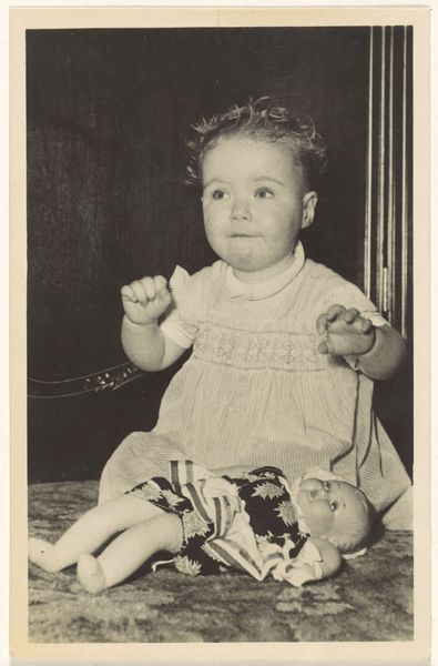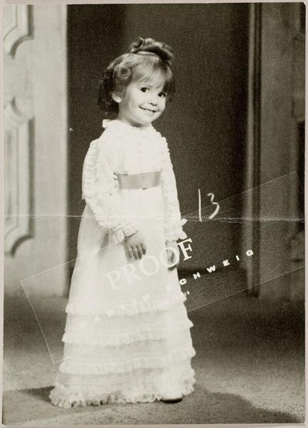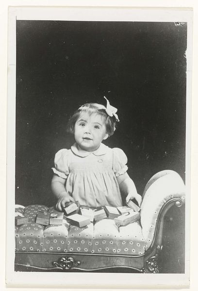 Curator: This photograph by Martin Schweig, held at the Harvard Art Museums, presents a young girl in a dress and cross necklace, seated in a chair. Editor: There is something so quietly unsettling about this portrait, a blend of innocence and posed formality. The stark lighting contributes to a sense of unease. Curator: The composition is rather traditional, centering the girl. Note how Schweig employs subtle tonal variations to define the textures of the carpet, the girl's dress, and the wooden chair. Editor: I am more drawn to the material culture embedded in the image. The dress, the shoes, even the carpet – these are all products of specific industries and labor practices. What can they tell us about the social status of this girl and her family? Curator: The cross necklace, a key semiotic element, suggests a certain religious upbringing or symbolic declaration. The girl's direct gaze is a formal element of the portrait. Editor: I keep thinking about the process involved: the photographer, the studio, the development of the image. All these stages involve materials and labor often unseen, adding layers of meaning. Curator: A fascinating tension arises between the formal and the material. I appreciate the different perspectives. Editor: Indeed, it provides a richer understanding of the photograph and its place in our cultural understanding of portraiture.