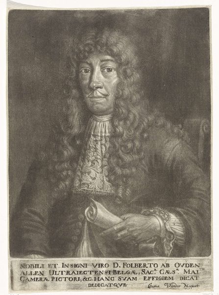Curator: This is "Portret van Nicolaus Christoph Lunker," made sometime between 1670 and 1713 by Pieter Schenk. It’s currently housed here at the Rijksmuseum. Made using engraving, a printmaking technique...what strikes you about this image? Editor: The meticulous detail! I'm captivated by the hair; it has an almost… electric energy about it. But overall, I get a sense of reserved formality. What's your take on it? Curator: Reserved formality indeed. It's that Baroque dance between extravagance and control, isn't it? Think of the powdered wigs, lace, and imposing expressions. It’s like the artist is saying, “Yes, I am powerful and wealthy, but also refined and considered.” Schenk's really emphasizing Lunker's status. How does the fact that this is a print – something reproducible – change how we think about its message? Editor: Hmm, interesting. Does the printing technique, making the image reproducible, suggest the artist wanted to circulate the sitter’s image widely, to promote his status and influence perhaps? Almost like early public relations? Curator: Exactly! It suggests an intentionality of spreading his image and projecting power, which aligns beautifully with Baroque sensibilities. Though the portrait is full of pomp, it gives one something to think about in regards to celebrity today. Editor: I never would have considered it from that angle. This conversation has helped me appreciate the many layers of meaning in even what appears to be a simple portrait. Curator: And for me, it highlights how even seemingly antiquated forms like engraved portraits speak volumes about timeless human desires like influence and legacy. A fascinating dialogue, indeed!