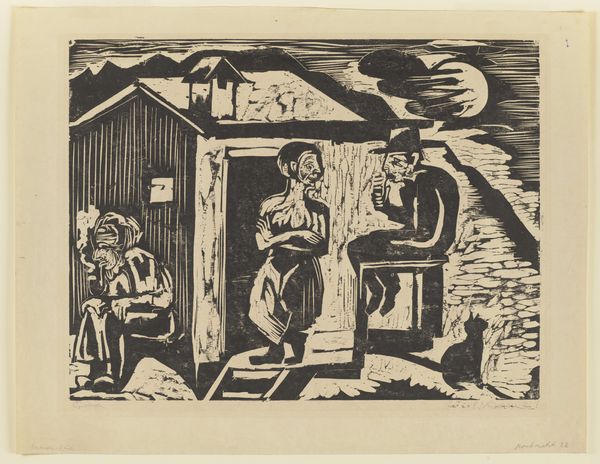 Ernst Ludwig Kirchner made this etching, Alpine Huts in Fog, at an unknown date. It shows two figures outside a building in a mountain landscape. The image uses visual codes from German Expressionism to express psychological states. Kirchner was part of the Die Brücke group in Dresden before World War I. The group looked to non-western art for ways to represent emotional experience through distorted forms, flattened space, and intense color. After the war Kirchner lived in the Swiss Alps, where he developed a new style influenced by Cubism and a return to more traditional landscape. But the influence of Expressionism remains. As historians we use archival material, letters, and exhibition reviews to understand the social and institutional context of this work. Kirchner lived through a period of upheaval in Germany as well as personal trauma, so we may see his mark-making as an indication of social alienation.