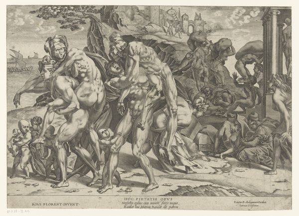 Curator: Johann Sadeler I created this engraving, "Christus in het voorgeborchte: 'die nedergedaald is ter helle, de derde dag verrezen uit de doden'," in 1579. Editor: The chaotic energy really grabs me! It feels like a literal descent, a visual depiction of breaking through earthly constraints, made all the more poignant by the medium of print and the labor invested in it. Curator: The composition reflects theological debates of the time, portraying Christ's descent into Limbo to liberate righteous souls—an apocryphal story not found in all Christian traditions. Notice the clear division: above, damnation, and below, liberation through Christ's sacrifice. Consider its relationship to societal structures... who benefits from emphasizing these binary power dynamics? Editor: Right, and seeing it as an engraving reminds me how these images would have been reproduced and disseminated. We need to remember the workshop processes, the artisan's hand tracing these theological concepts. The sheer repetition underscores the religious doctrines in early modern European society, while also thinking about printmaking as an important element to artistic dissemination. Curator: The positioning of Adam and Eve to the right, juxtaposed with those shackled in darkness, creates an interesting tension. It speaks to prevailing beliefs about original sin and redemption within the confines of Northern Renaissance aesthetics. How does seeing them positioned at the margins influence our perspective of their roles within this theological structure? Editor: Absolutely! And consider the materials – ink, paper, the metal plate from which this comes. These weren't passively consumed; they were circulated, traded, and owned. I would love to research the engraver's influences as well! Curator: It is a powerful visual translation of complex theological narratives, indicative of the Reformation era’s preoccupation with sin, redemption, and judgement. Editor: Exactly. Seeing how meaning and belief are physically pressed onto a surface—it helps demystify some of the lofty symbolism and reveals the means of production that perpetuated it. I feel that offers a different perspective on the narrative.