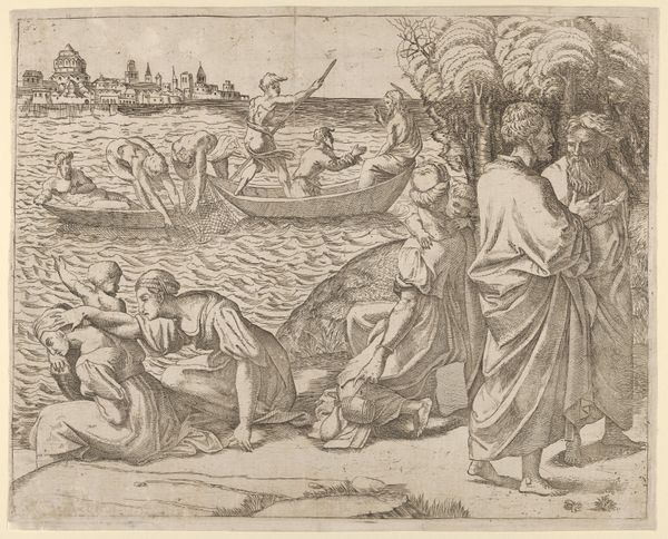 Editor: This is "Five Women in a Boat, Holding Palm Leaves," a 16th-century engraving. It looks like an illustration from a book. The women seem calm, even stately, despite being on the water. What do you see in this piece, focusing on its artistic composition? Curator: The composition immediately draws the eye to the interplay between the figures and the constructed space of the boat. Note how the linear quality of the engraving emphasizes the form of the boat. How do the circles adorning the boat affect your perception of depth and space? Editor: They flatten the image somewhat, like decorative elements instead of contributing to a realistic perspective. It feels both sophisticated and a little naive. Curator: Precisely. The artist balances pattern and representation, highlighting the tension between surface and depth that is characteristic of engraving. The subtle variations in line weight suggest an attempt to model form, but it is the graphic quality that truly shines, doesn't it? The formal choices push against perfect representation to hint at symbolic meaning. Editor: So, even without knowing the precise subject, we can appreciate how the artist manipulates form and line? Curator: Indeed. This work offers rich aesthetic rewards through its formal attributes alone, allowing the viewer to investigate and consider the symbolic meanings embedded within the image. I would focus my interpretation through this structured composition, rather than assume there is historical accuracy. Editor: That’s fascinating! It’s made me rethink how I initially approached the image just based on subject matter. Thank you. Curator: You’re welcome. Considering artwork in this manner provides a powerful avenue to enhance not only the comprehension of images from diverse periods but also one’s understanding of our relationship with art and the historical evolution of representation.