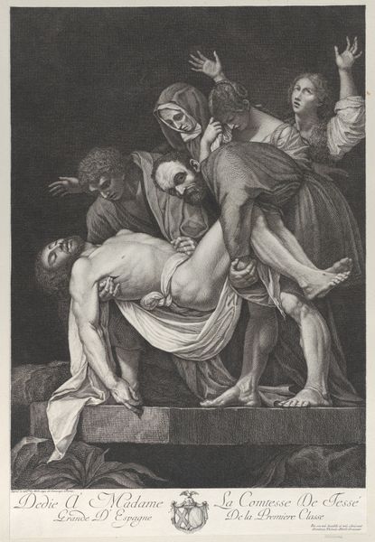 Curator: Well, this print certainly has a lot to say. My initial impression is a blend of melancholy and, dare I say, a slightly theatrical flair. It's like a scene lifted straight from a rather dramatic Baroque opera. Editor: Exactly. What we’re looking at is "Death of St. Francis" attributed to Pierre François Basan. Though, to be fair, it’s after a design by another artist. Basan worked his magic somewhere between 1733 and 1797 and it’s now housed here at the Rijksmuseum. Curator: What really pulls me in is the skull clutched by St. Francis. The skull is not just a reminder of mortality, but an embrace of it, a serene acceptance. Then there are the angels, of course, arranging the crown of thorns almost like stagehands preparing a martyr for his final curtain call. Editor: Yes, those angels... they're draped and styled according to classic allegory. It reminds me of earlier Renaissance and Baroque visualizations. What stays is the human longing to see the transition from this earthly existence to the next framed as beautifully and benevolently as possible. The image offers viewers not just narrative closure but emotional resolution, too. Curator: You've hit on something profound there. Resolution. That yearning is part of the draw of religious iconography as a whole isn’t it? It reminds me of visiting my grandmother in her old house, her collection of similar depictions acting as emotional placeholders of a sort. Visual mantras, if you will. I imagine such pieces offer much solace. But what do you make of St. Francis's upturned eyes? Editor: Oh, they are completely spellbinding. The upward gaze—a universal gesture representing divine connection or visionary experience. It creates an almost direct path from the body to the heavens, circumventing the grim reality of the skull. That’s where a certain caricature can be found too. But ultimately? It's about transporting the soul beyond the physical pain. Curator: Right! And the detail...the subtle gradations in the engraving capture the folds of St. Francis's robe and the softness of the angels' skin beautifully, adding layers of depth and texture. It transforms what could be a straightforward religious scene into a study of light and shadow, making the divine tangible, or at least… more imaginable. Editor: A thoughtful take that underscores, really, the image’s inherent tension. The dance between symbolism and skill speaks not only to artistry but also to how we perpetually attempt to frame life’s major passages with meaning, memory, and, let's face it, more than a little theatricality. Curator: Indeed. A rich little piece that invites a moment's contemplation of faith, art, and the final act we all must face. Editor: Quite so. It proves yet again the eternal allure—and utility—of powerful imagery when staring down those existential questions.