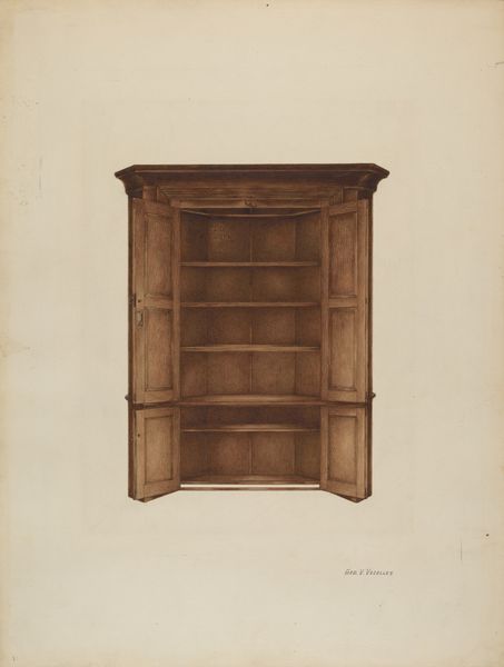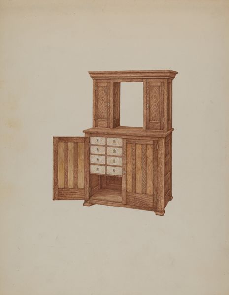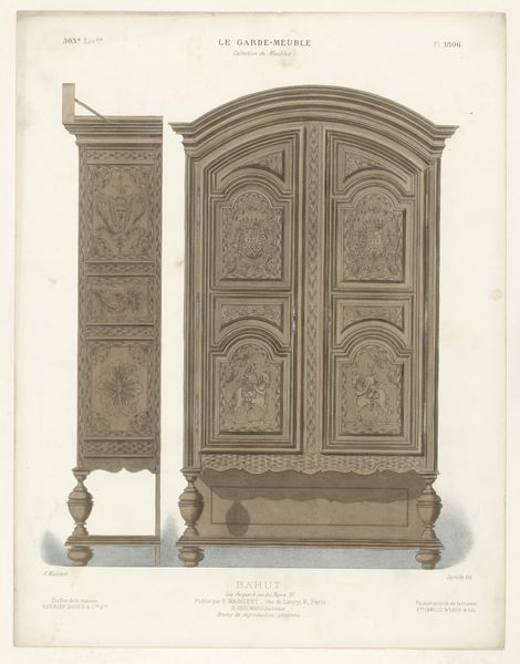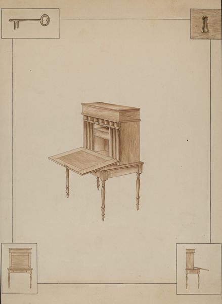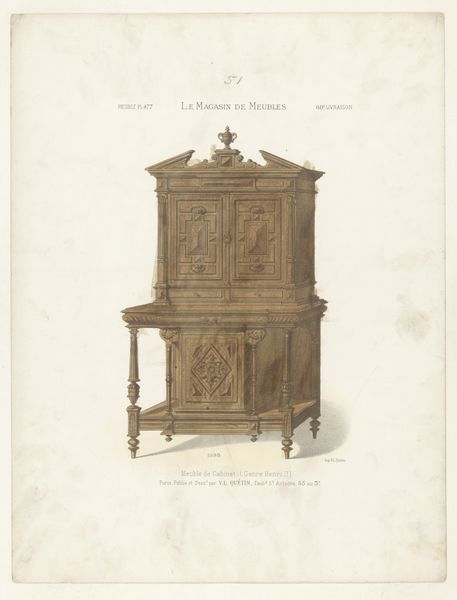Curator: This image, created sometime between 1832 and 1877, presents us with an intricate vision of what the artist refers to as a “Bureau met boekenkast”—a desk with a bookcase. It’s unsigned, so the artist remains anonymous. What strikes you most about this piece? Editor: My first impression? Intimacy. There’s a sense of enclosed, personal space created by all those nooks and crannies. It's as if it invites secrets, doesn’t it? Like a miniature world for papers, thoughts, and perhaps a hidden sweet or two. Curator: It’s interesting that you mention secrets. The form certainly has a historical symbolism. Consider how many official documents, love letters, and financial ledgers such a piece of furniture might have safeguarded through time. Think of this not just as furniture, but as the silent witness of human affairs! Editor: And look at all those drawers—perfect rectangles just BEGGING to be filled and organized. There is such care put in showing depth using gradients of ink. In the center of the desk area, one can almost see sunlight playing on the polished surface, a subtle suggestion of warmth. Is it me, or does this have the charm of a miniature architectural model? Curator: Absolutely! The visual vocabulary has echoes of neoclassical architecture – that elegant, almost temple-like presence achieved through simple forms and balanced composition. Beyond its artistic or decorative function, there’s a strong functional aspect, a design suggesting utility but in this case one of great artistry. Editor: I like to imagine this piece, realized in the real world, not just in the lines of this artwork. Made of heavy dark wood, mahogany, I'm thinking, solid, anchored to the floor, yet at the same time so full of potential for inspiration and new creations. There is a distinct sense of domesticity conveyed. It has quite the charm for what seems like decorative art! Curator: The artist, though unknown to us, leaves behind not just a portrayal of furniture, but really, a window into a bygone era where handcrafted artistry was at the heart of even everyday items. It makes us appreciate the sheer dedication to craft in a time before mass production. Editor: Right, you said it well. It’s more than just furniture, it is a vessel of memory, imagination, and countless untold stories!