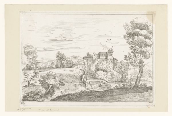 Curator: We're standing before Jean-Jacques de Boissieu's "View of the Temple of Vesta," crafted in 1774. It's currently held at the Metropolitan Museum of Art. A complex print made via etching and engraving. Editor: It has the hazy quality of a dream, or maybe just heat shimmering off old stones. Ruins bathed in light, rendered with incredible delicacy. Do you get a feeling of melancholy looking at it? Like beauty fading? Curator: Definitely, that sentiment resonates with Neoclassical art which harkens back to the grand forms of antiquity. Think about how printmaking facilitated the circulation of these classical ideals, taking Roman visions to a wider audience. The material process is very important in democratizing access. Editor: That's interesting! It almost feels like this romantic gaze onto a ruin transforms the labor involved; an idyllic vision arises as one considers the repetitive and careful process that would give form to this precise depiction of an Arcadian vision. The animals seem almost carelessly added, in contrast with the meticulous detail given to the architecture, like, oh here comes real life into the composition! Curator: These idyllic scenes were incredibly fashionable among the European elite; such pieces operated within a network of trade and taste. I wonder how Boissieu adapted his technical skill, to meet demands of the print market. He transforms, cheapens, or heightens its impact. It also places labor as more of a commodity, doesn’t it? Editor: The layering of tones adds real depth. I am picturing de Boissieu working on the etching plate with incredible patience. Maybe it's less about the labor becoming a commodity and more about art's accessibility and influence through it. It's almost as if the Temple becomes accessible through de Boissieu. I feel as if a gate has opened, allowing me into an artist's consciousness as well. Curator: Perhaps the most romantic gate that capitalism can devise, yes? To think about the image of a structure that inspired the artist—transposed through an arduous, manufactured process is very important in itself. The image's function—aesthetic, economic, or something in between, can vary between its various social spheres, in both past and present! Editor: It does provide endless points to explore. I love the way this piece feels both meticulously rendered and somehow effortlessly dreamlike! It gives me room to breathe and imagine what stories could emerge out of it.